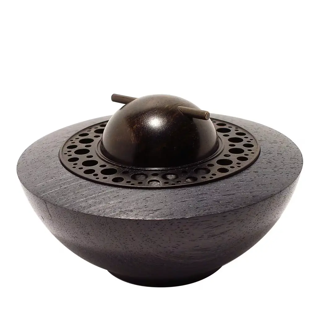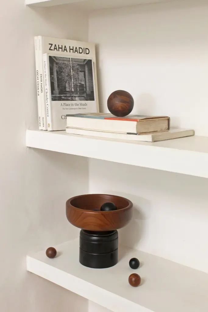 Kori Basket Black by Studio IndigeneDimensions: D 19.05 x W 19.05 x H 17.78 cm Materials: Reclaimed Teak Wood.Colors Brown, Natural Wooden Finish. The Kori basket is hand-turned in reclaimed teak wood, holding yourfresh flowers, fruits, potpourri or small collectibles. Imagined on your dining or coffee tables, the Kori becomes a great companion while you host guests or stands in its wooden glory as a decor piece on your wall shelves and consoles.Studio Indigene looks at objects of varied scale and functionality; objects of decor and daily use. All the designs incline toward achieving clean lines and curves.The designs are minimalistic, with a keen experimentation of volumetric configuration and combining one or two materials with a base material, our favourite - wood.The studio is a medium of projecting our design sensibilities onto objects of utility and décor, trying to achieve visually appealing ratio and proportion. Our designs are realised by skilful handcrafting of our woodworkers; the process behind the making of each product is artful. Well-seasoned wood, finishing materials of the best quality are also attributes that transfigure our products; give them a premium form. Each product is singular, in the realest sense, at our studio.Studio Indigene is the brainchild of two architects - Tanvi Deolekar & Shubham Mestry. Meet our founders, who form the small team at Studio Indigene.