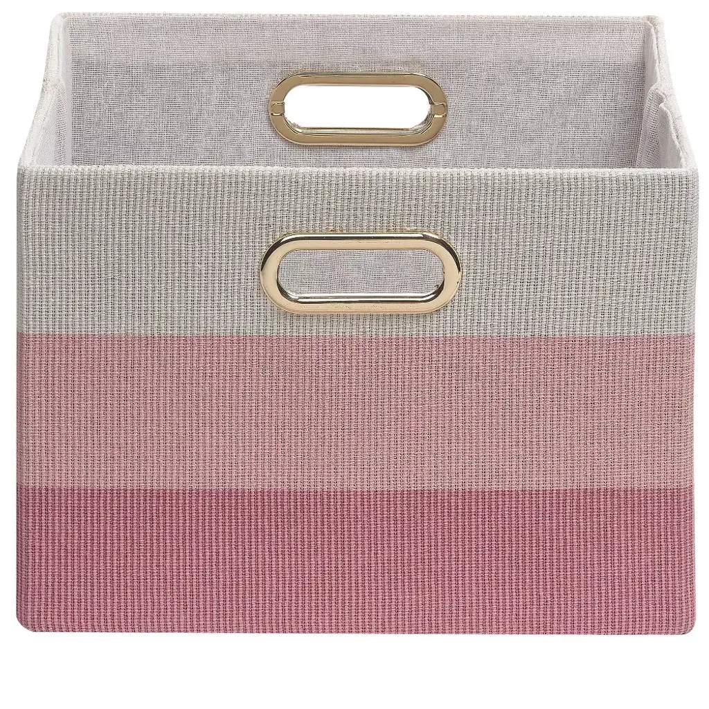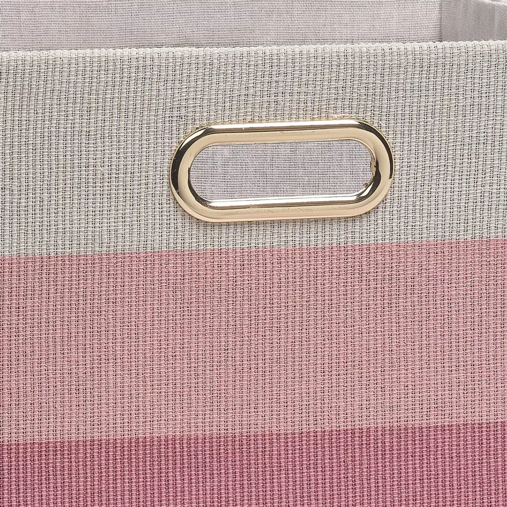These sturdy ombre storage baskets are the perfect addition to your stylish nursery, playroom, kids’ room, and even your office. They are made in a cross-weave textured cotton, poly, rayon fabric with a poly cotton rayon lining. There are two built in gold metal handles for easy carrying. The baskets are 12 ½” X 11” X 9”. The color sequence is natural cream at the top, medium pink in the middle and dark pink at the bottom. Spot clean only.