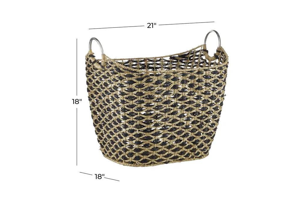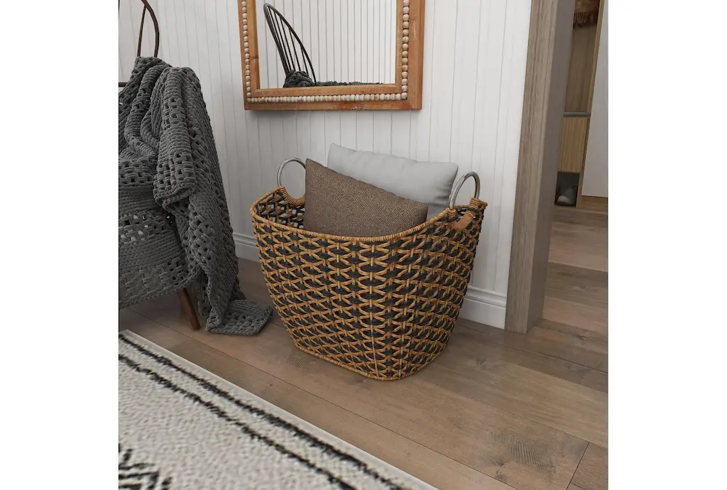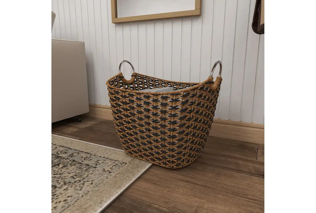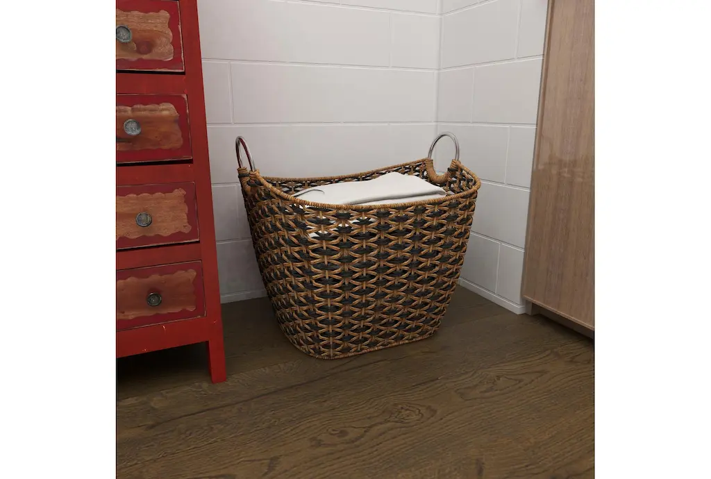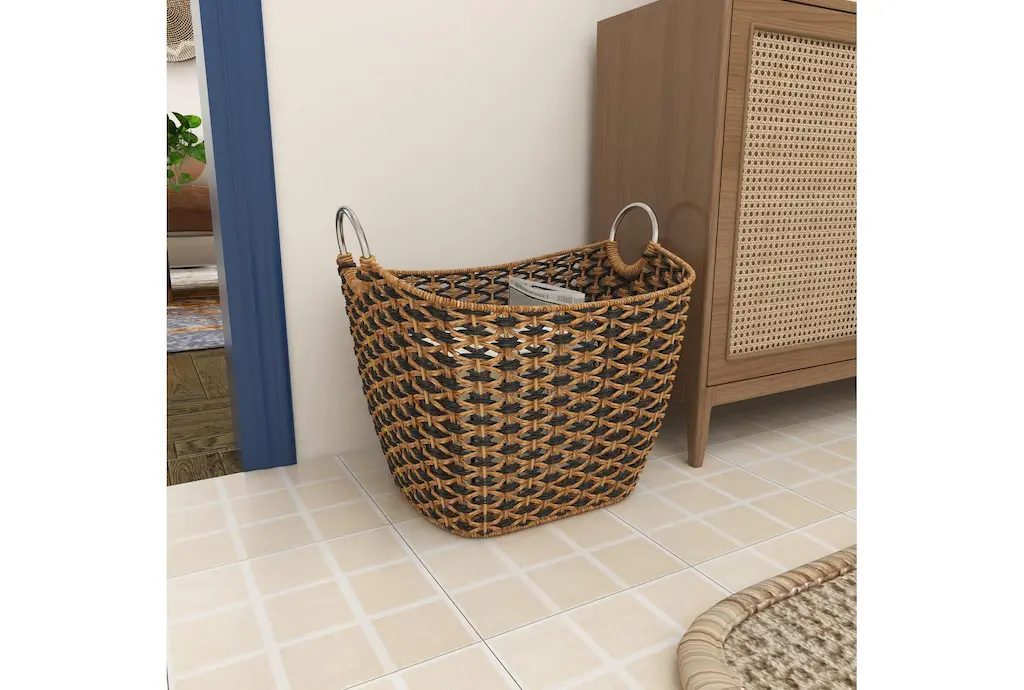 Add a dash of natural beauty within your light-toned living spaces as you place your clean laundry, blankets, and pillows on this multi-purpose wicker basket. This item ships in 1 carton. Easy-carry, sturdy steel handles. Due to the handmade nature of these, there will be slight color, shape, and size variations, as well as loose fibers. Suitable for indoor use only. This item ships fully assembled in one piece. Maximum weight limit is 5 lbs. Made in Vietnam. This is a single brown colored basket organizer. Bohemian style.