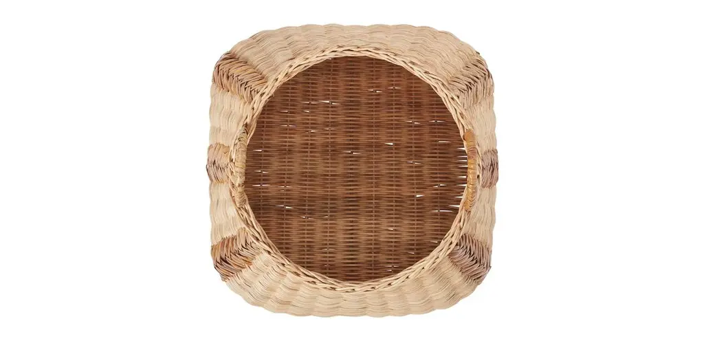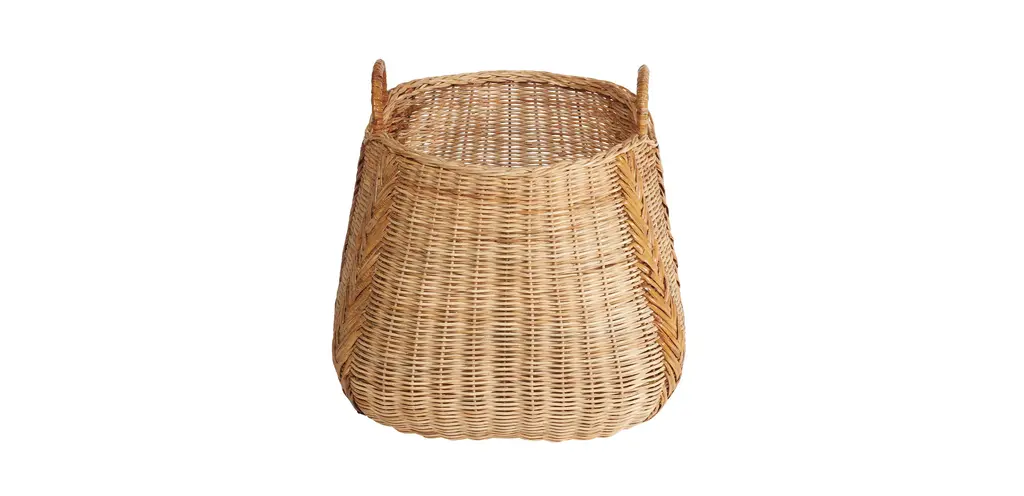 A mix of woven wicker textures and colored rattan in a chevron pattern gives this storage basket a fun personality. Its unique shape is perfect for stowing hard-to-corral items like throw pillows, slippers, or even firewood.