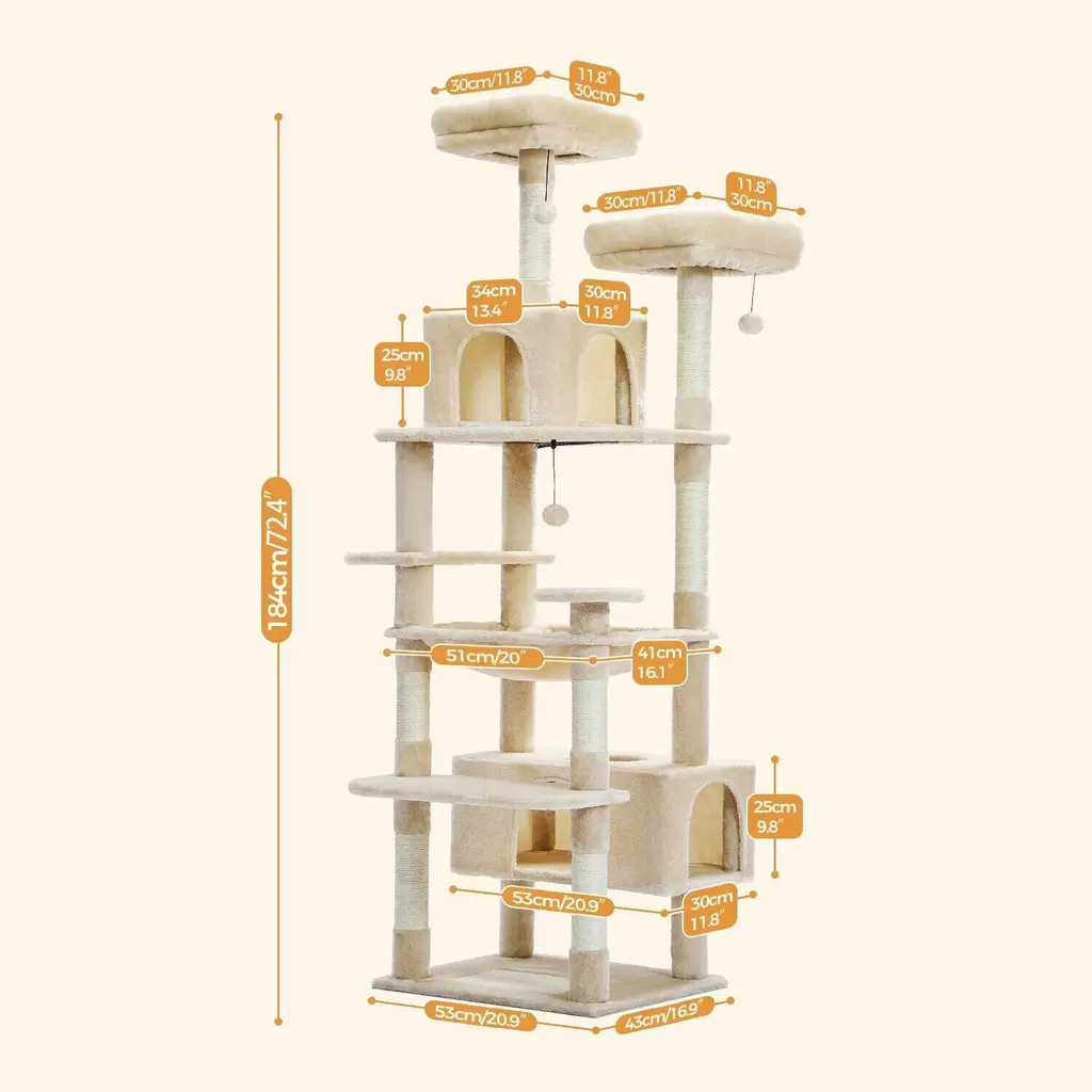 Large Cat Tree, 72" Cat Tower, Cat Condo W/sisal-Covered Scratching Posts & Pads, 2 Padded Perch, Dual Condo & Basket - Beige