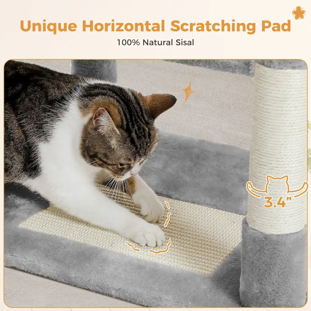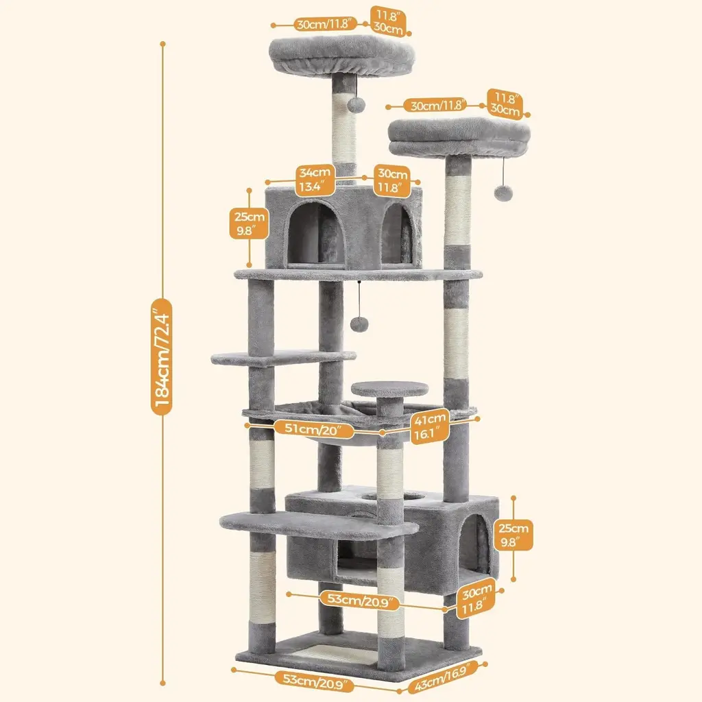 72" Tall, Endless Climbing Fun: With the total height of 72" in 8-level structure, the super large cat tree is perfect for 4-5 big cats who love climbing up and down together. The needs of scratching, climbing, sleeping and exercising can also be fully satisfied! Especially the unique rectangle super large cat condo and wide hammock are much larger than normal ones and perfect for cats resting together. Unique Wide&Vertical Scratching: Cats love to scratch. The unique scratching pad with the large size of 10.2"X6.7" on the bottom provides one more horizontal area for cats sharpening nails and having fun. Plus, with 7 reinforced posts wrapped with natural sisal on multiple levels, they can scratch to their hearts' content and keep away from expensive furniture! Designed for Large Cats: Featuring a super large hammock, it is stable&wide enough to support your 2 fatty furry friends having a catnip.And the extra spacious cat condo measuring 21"X12"X10" perfectly satisfy the needs of sleeping and playing. Fully stretching their bodies, Lounging for a nap, playing hide-and-seek, chubby cats(like Marine Coon and Ragdoll between 15-20 lbs) could do whatever they want in this condo paradise. Have Fun In Safety: Security is always the priority. Sturdy construction with a large thick base could support your kittens to climb up and down safely. Solid particle board provides excellent durability and premium plush material offers a skin-friendly experience. Also, the posts are covered with 100% natural sisal to perfectly meet scratching needs.