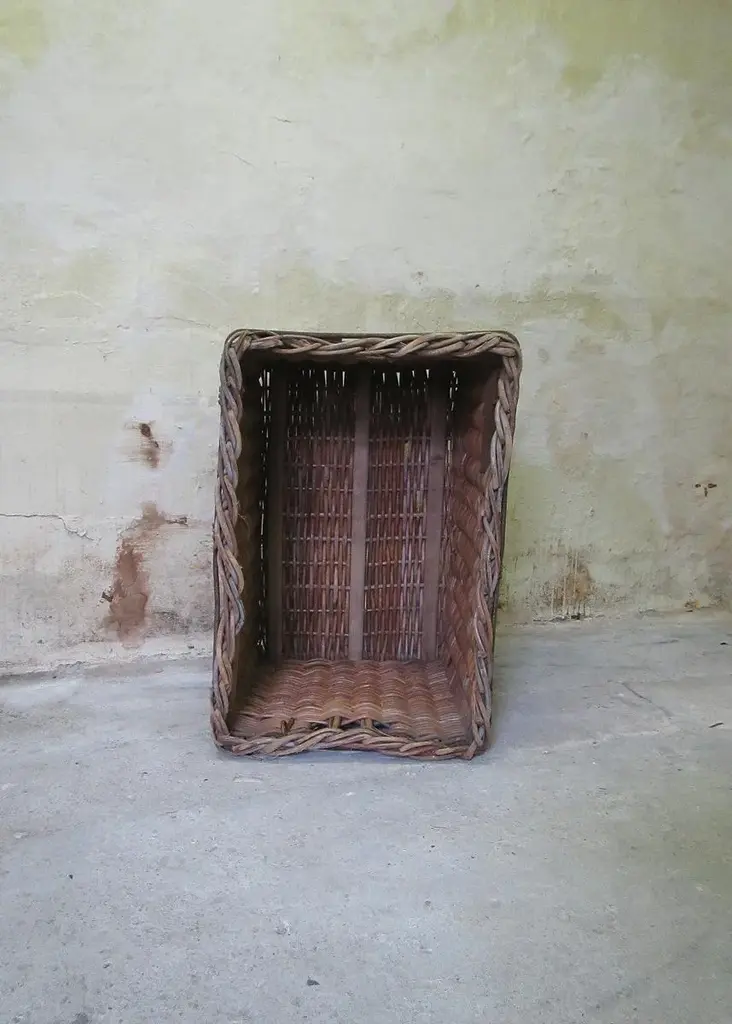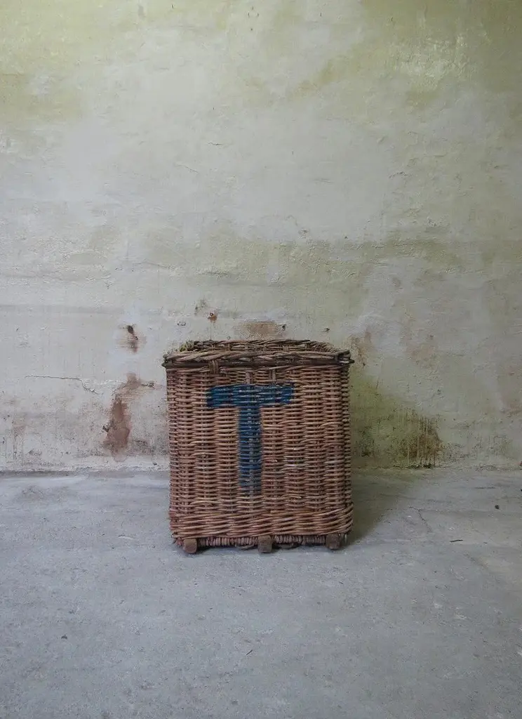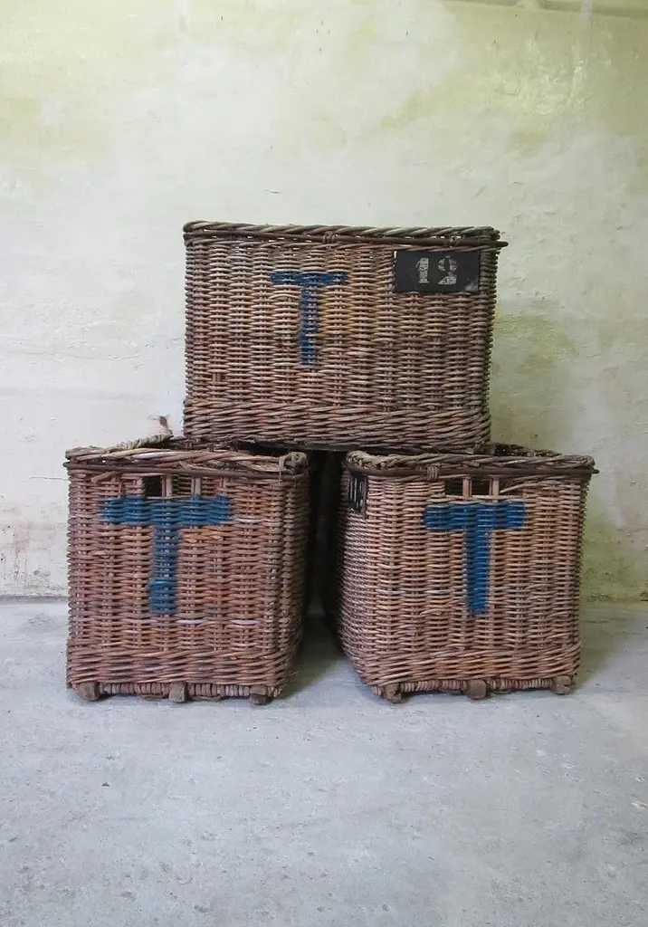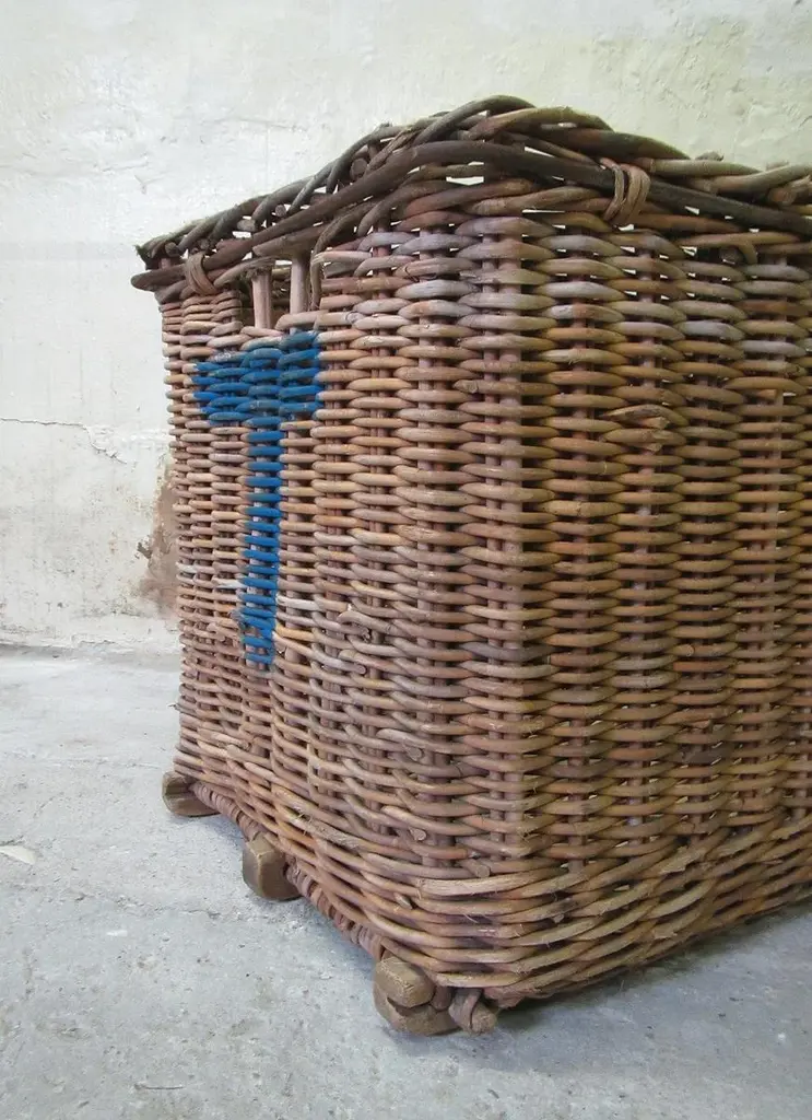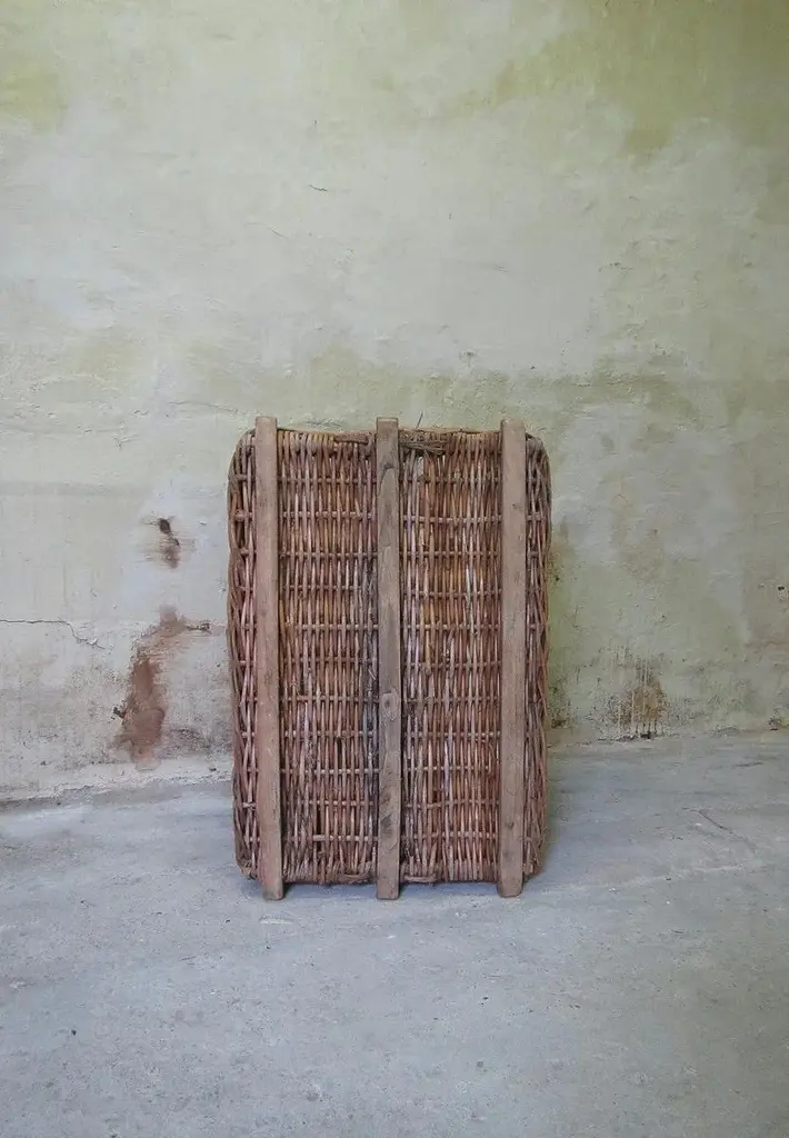 This large storage basket was produced during the 1930s in Belgium. It was originally developed for the internal transport of cotton in a Belgian cotton factory. It is made from plaiting and the structure is supported by iron supports. The numbers on the side refer to the weight of the wool carried. This item is in a good vintage condition having been thoroughly cleaned, with signs of wear consistent with age and use.