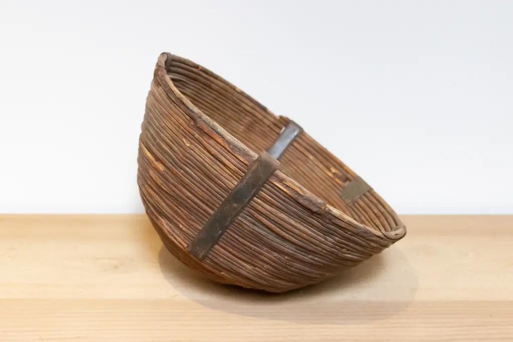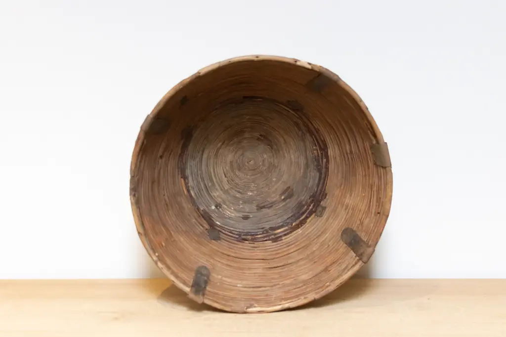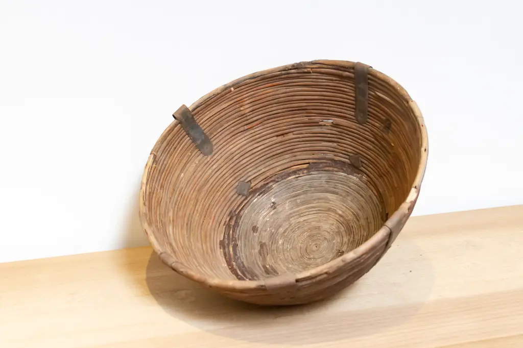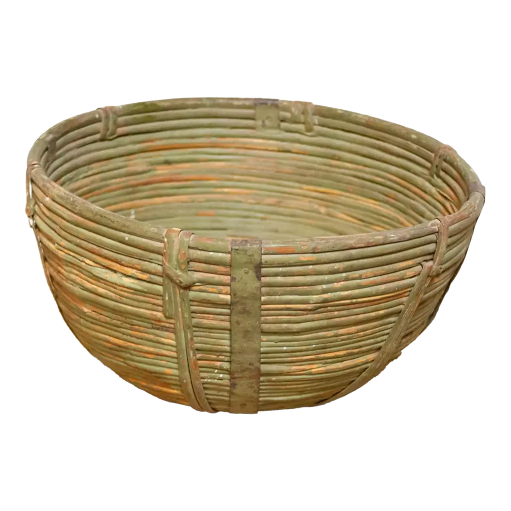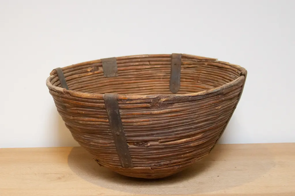 Charming handwoven farmhouse basket - a true piece of craftsmanship! Originally designed for carrying and displaying fruits and vegetables, this vintage woven basket features interlacing wicker, reinforced with sturdy iron straps for added support. Handmade with love and skill by local artisans in the highlands of West Bengal, nestled next to the majestic Himalayas mountains, this basket embodies the rich cultural heritage of the region.