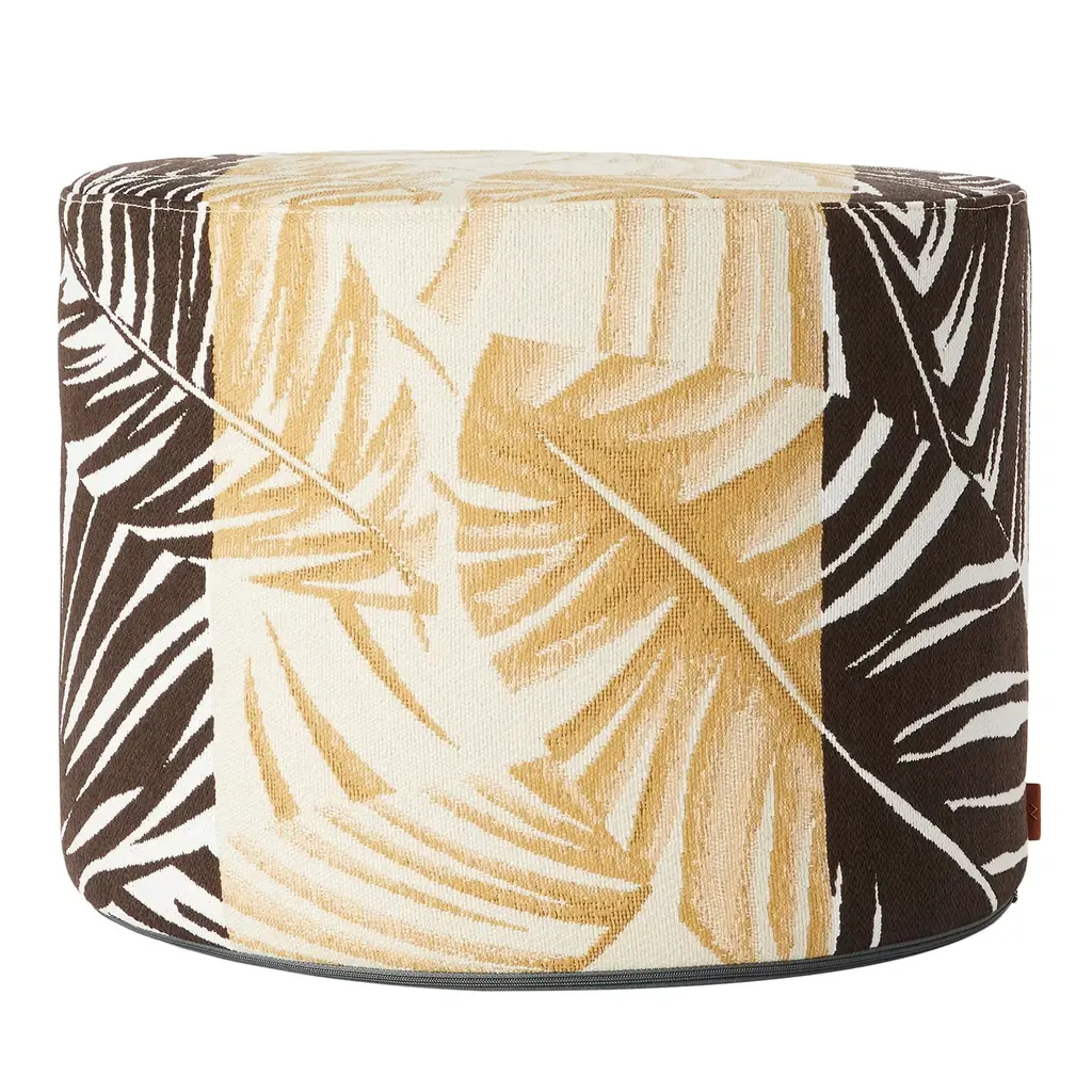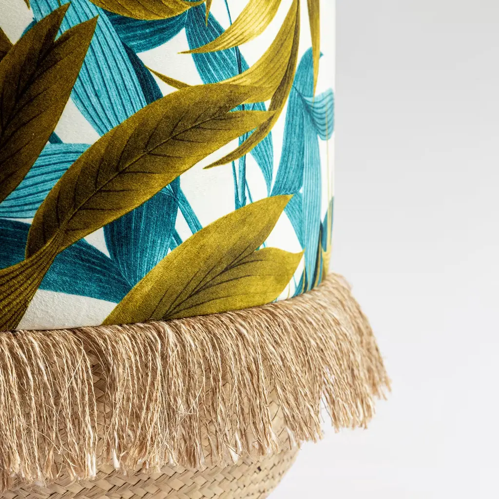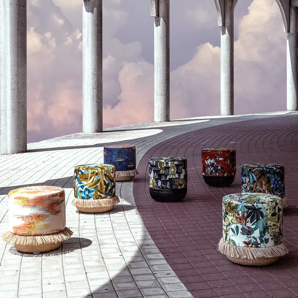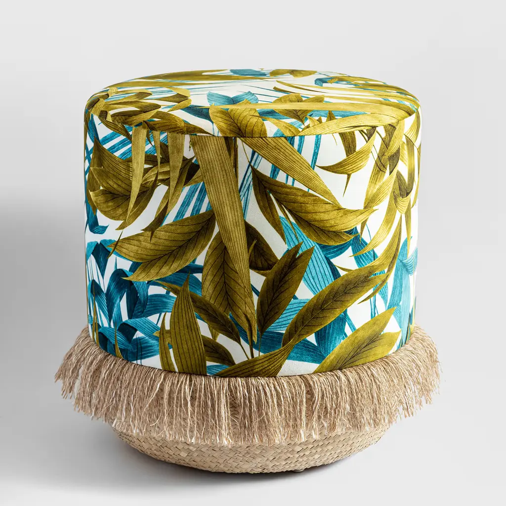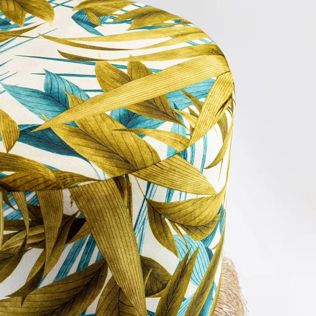 Inspired by designer Vito Nesta's extensive travels around the world, this elegant pouf evokes images of the rainforest, adding a relaxing touch to any interior with its green tones. Supported by a sturdy beige base crafted of straw and adorned with a playful fringe, its cylindrical body showcases a soft velvet upholstery with a refined pattern of intertwined, overlapping palm leaves in turquoise and golden colors.