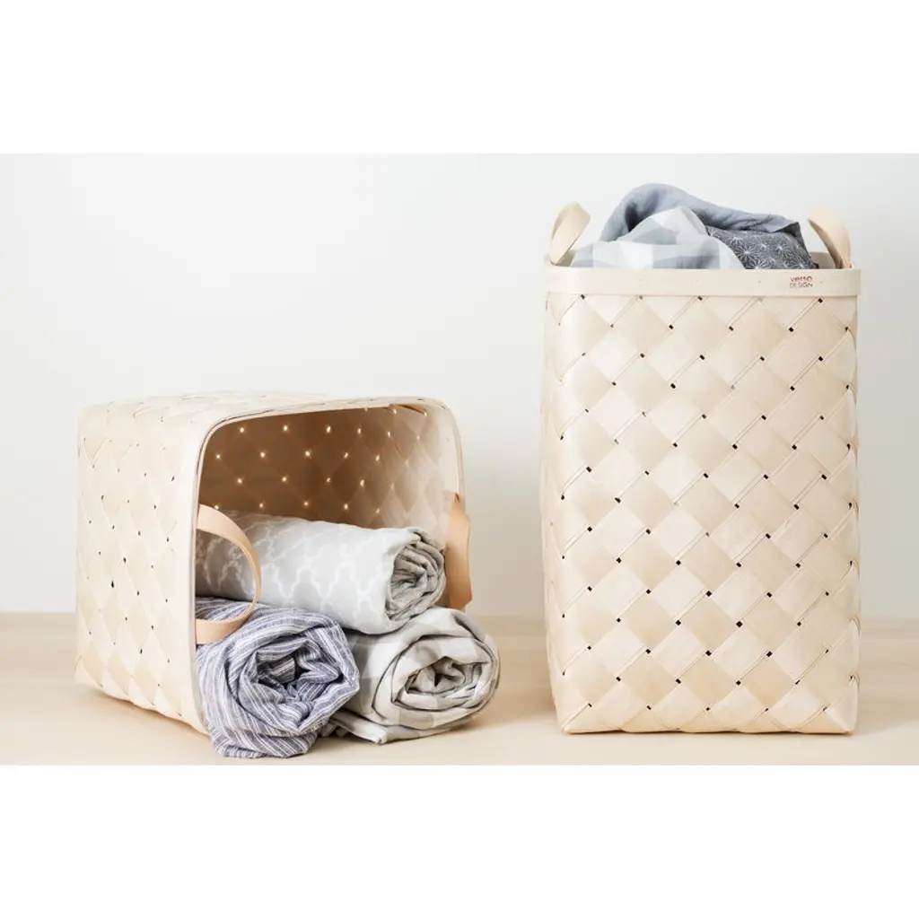 The Lastu basket is a modern version of a traditional woven birch basket. Lastu is suitable for all kinds of storage use, from toys and magazines to clothing. Two layers of birch provide more durability and the beautiful leather handles add a nice touch.