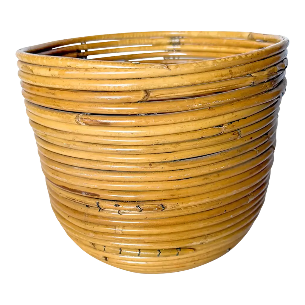 A Chinese late Qing Dynasty period varnished bamboo basket from the early 20th century with rattan tied handles. Created in China during the late Qing Dynasty period in the early years of the 20th century, this bamboo basket was likely used as a hat basket. It features a circular slatted body topped with a flaring mouth. Two handles are secured to one another through woven rattan. The entire piece is made of carved bamboo, varnished in a brown hue. This late Qing Dynasty period Chinese varnished bamboo basket from the early 20th century will make for a charming decorative addition to any home, placed in a living room, kitchen or dining room.