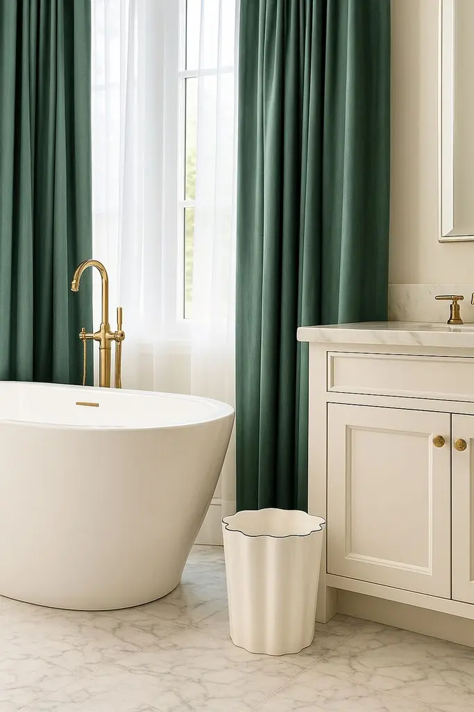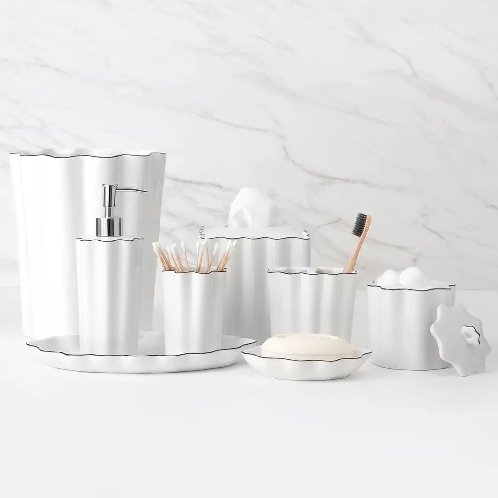 Le Marais Bath Accessories Collection is crafted from fine porcelain. Each piece features an scalloped design with black-trim detail on top. Imported.