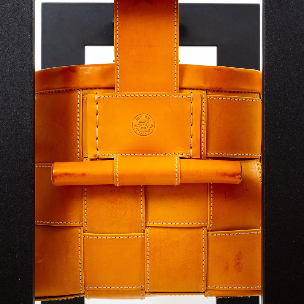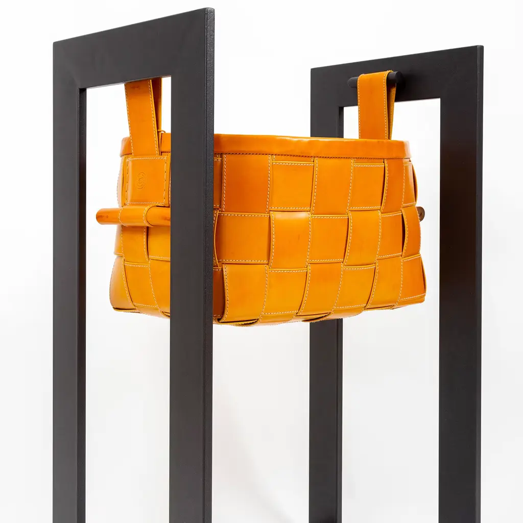 A handy organization tool, the Mustard Leather Basket with Stand gives you a place to store keys and tech accessories near the entrance. The basket is crafted in vegetable-tanned leather with side handles making it easy to carry. The basket rests on a unique stand, also providing a unique home accessory. The basket is available in several dark brown.