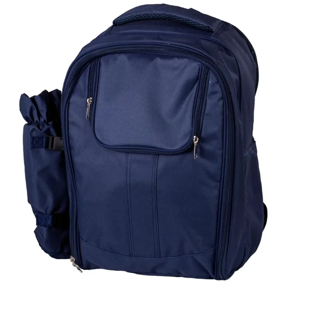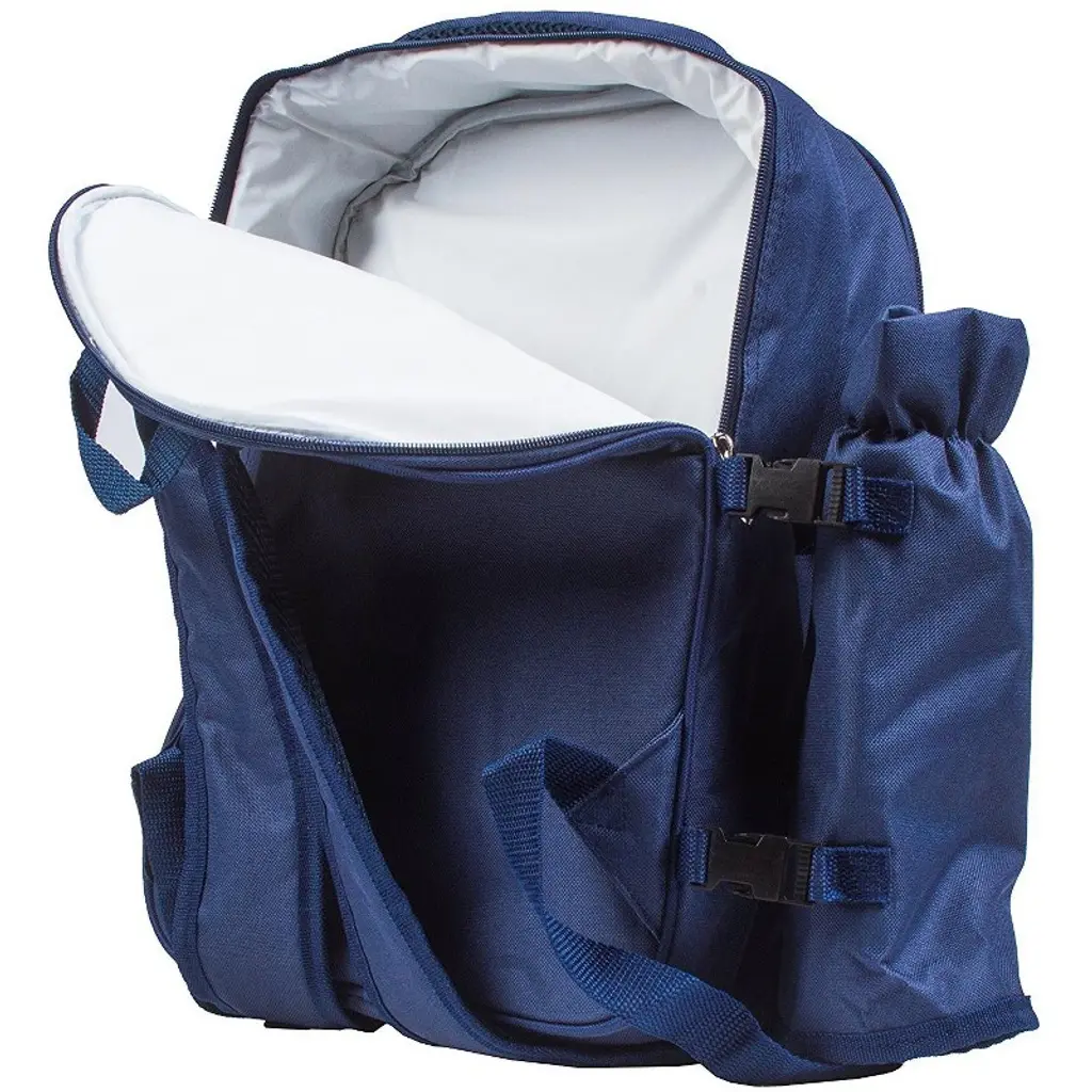 A perfect companion for picnics, camping, beach or any outdoor activity. Our premium picnic backpack made of poly-canvas fabric features thick PEVA lined insulated padding throughout. The separate divided compartment to hold your beverage bottles, easy access top panel with Velcro closure for bottles, double shoulder straps, contrasting trim, zippered compartment for all of your picnic essentials.