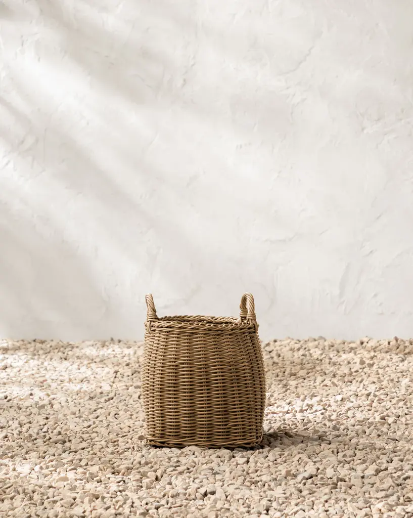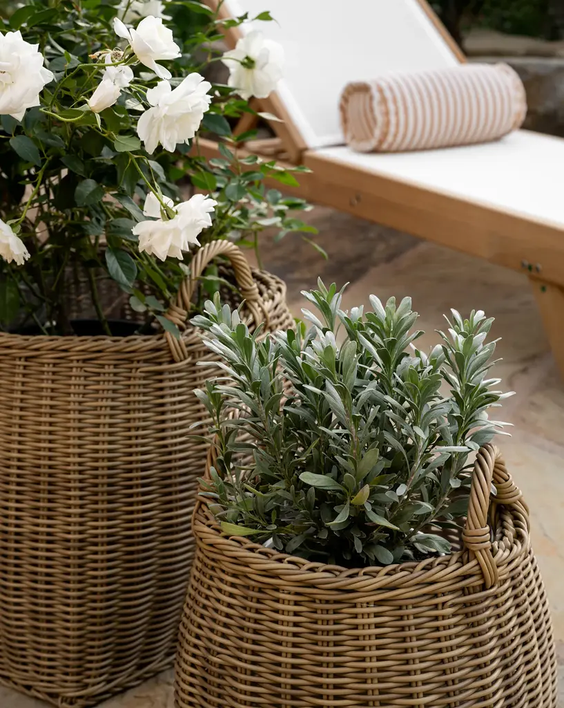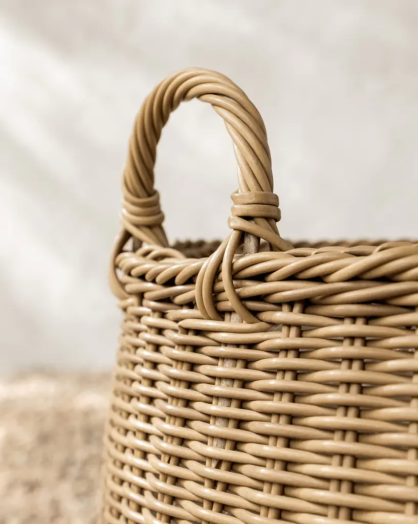Intricately woven in poly-rattan, the Lightwash Handled Planter Basket has a clever box design with rounded edges. Lined with a plastic insert, this piece is ready to handle small indoor plants or standalone as a textural addition to home decor.