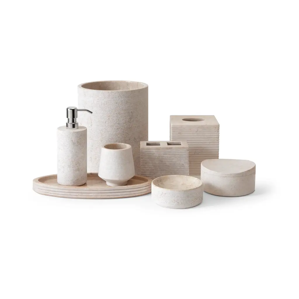 Enhance your bath and create a serene oasis with our Limestone Bath Accessories. Crafted from natural limestone, each accessory features subtle texture and earthy beige tones. Spot clean with damp cloth.