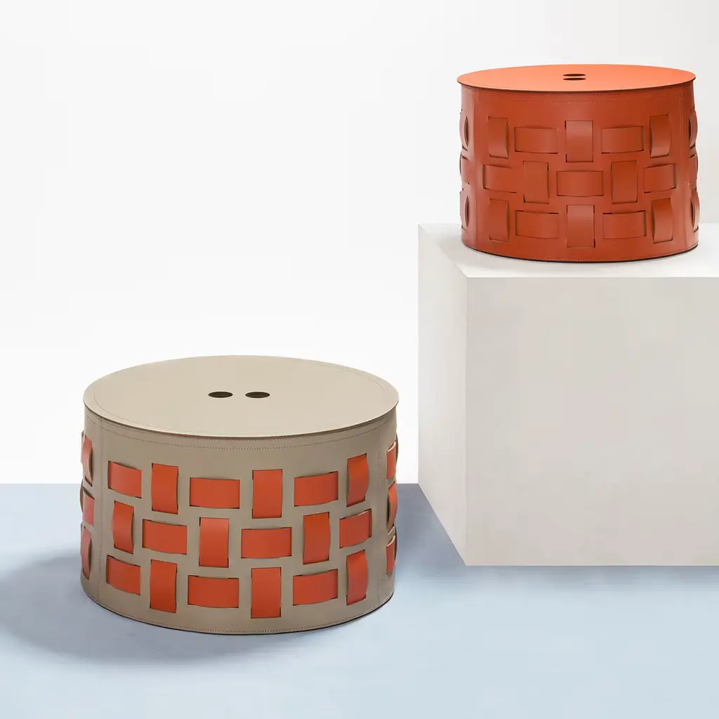 The Lisbona baskets' design comes from the variation of a classic weave with vertical and horizontal bands in which create to a mosaic effect. The surface that acts as a frame for the bands acquires importance and, from simple background, it becomes a decorative element able to enhance the weave and its design. Finest regenerated reinforced leather structure with water-resistant and UV-resistant finish. Ideal for laundry, towels, magazines or everyday objects. Fit for indoor and outdoor use.