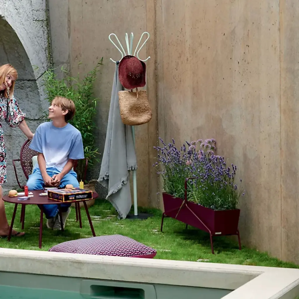 A great way to add color and graphic style to a patio or garden. The Long Basket Planter by Fermob takes its design inspiration from the classic shape of a wicker picnic basket. It has a long and low, angled aluminum planter box, which sits elevated within a steel rod stand. Two drainage holes can be plugged or left open to allow the planter to accommodate shallow plantings, storage for outdoor accessories and many other uses.