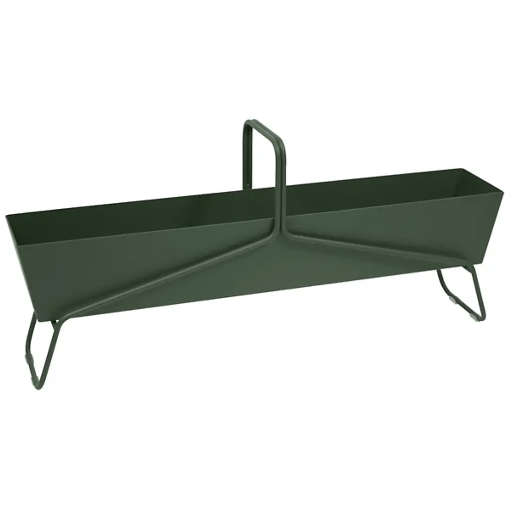 A great way to add color and graphic style to a patio or garden. The Long Basket Planter by Fermob takes its design inspiration from the classic shape of a wicker picnic basket. It has a long and low, angled aluminum planter box, which sits elevated within a steel rod stand. Two drainage holes can be plugged or left open to allow the planter to accommodate shallow plantings, storage for outdoor accessories and many other uses.