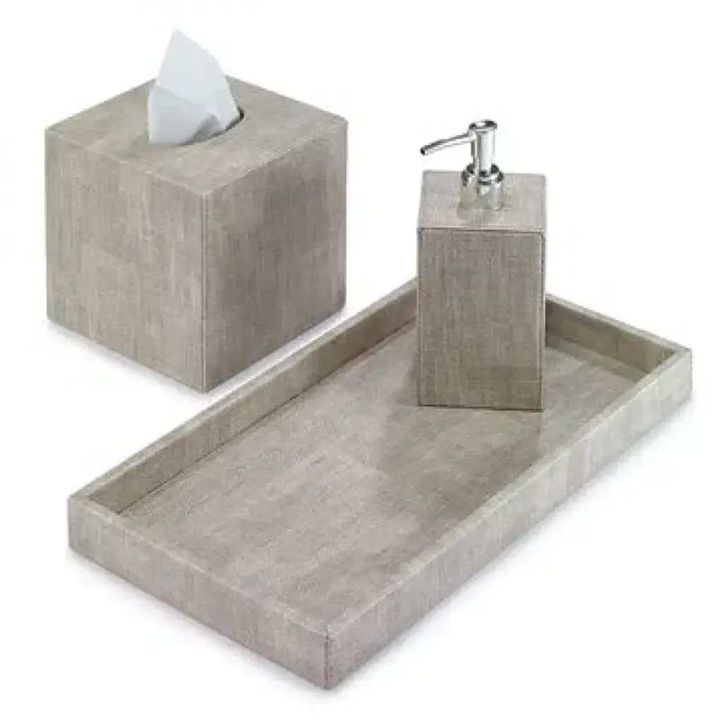This brand-new easy-care Bath Accessories line features the same luxurious material used in our Luster Placemats. This collection will bring a touch of sophistication to your room and make every day feel like a spa day! They are perfect for gifting or for pampering yourself. Available in Tissue Box, Vanity Tray, Soap Dispenser, and Waste Basket.