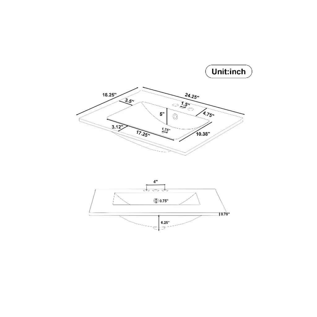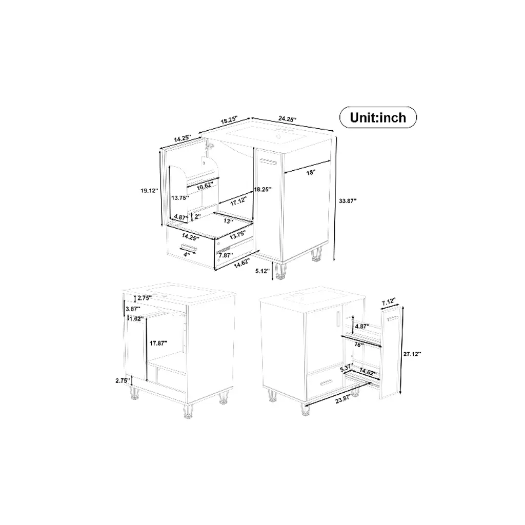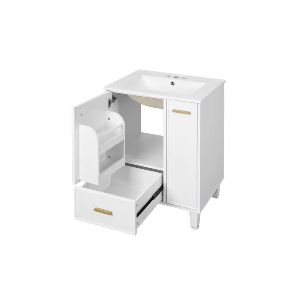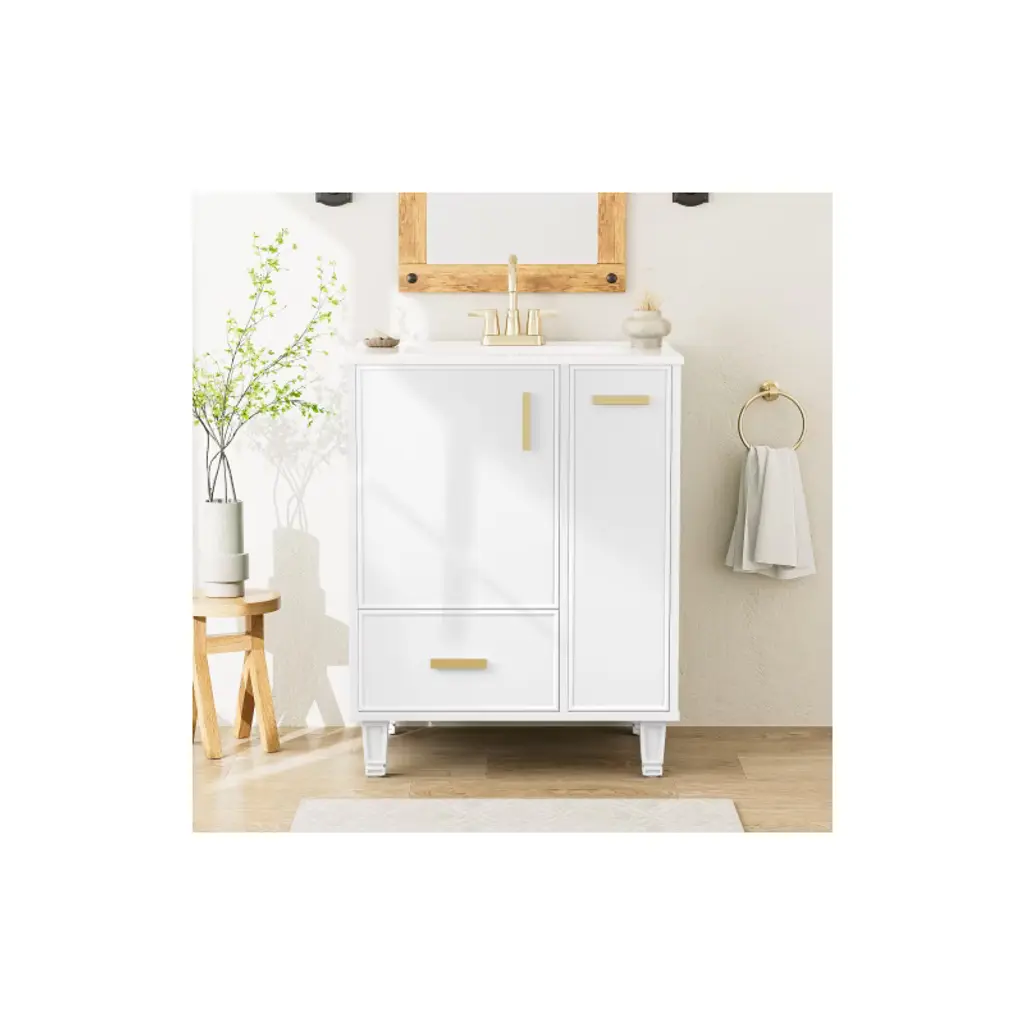 Elevate your Vanity Bathroom with this 24" Freestanding Bathroom Vanity— a perfect fusion of modern elegance, durable construction, and smart storage. As a Bathroom Vanity with Sink, it includes a smooth ceramic sink (easy to clean, water-stain resistant) with 3 pre-drilled holes (compatible with 4" centerset faucets, faucet not included) and a chrome-finish overflow to prevent spills. Crafted for longevity, it features a solid wood frame (adds natural warmth, ensures stability/load-bearing) paired with high-quality MDF boards (smooth surface, enhanced durability) and a crisp finish that complements small bathrooms, powder rooms, or primary ensuites. Designed as a functional Bathroom Storage Cabinet, it offers abundant organization: a cabinet with a door shelf, a 2-tier pull-out basket (for easy-access toiletries), and a deep drawer (for towels/bulk items). User-friendly details include soft-closing doors (reduces noise/wear), smooth-glide drawer tracks, and an open-back design (simplifies plumbing installation). Shipped in one package with a detailed manual and full hardware, this Bathroom Vanity is easy to assemble, blending style and practicality to enhance your Vanity Bathroom routine.