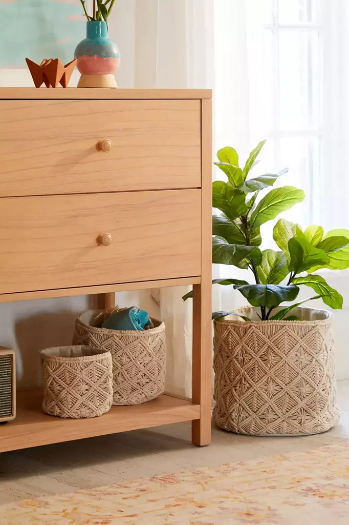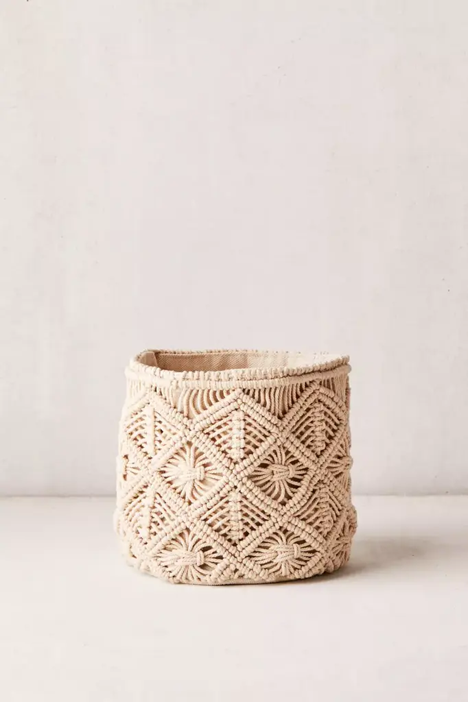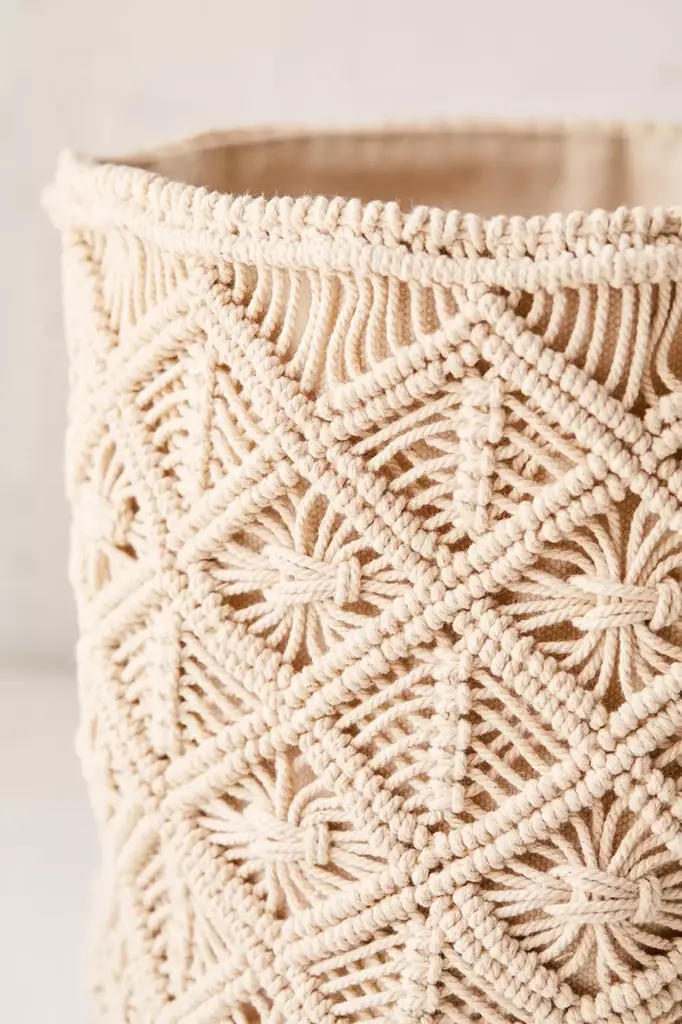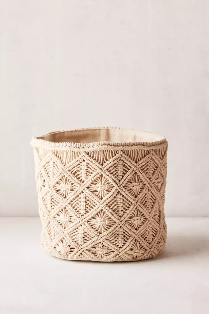 Perfect for storing blankets, magazines and trinkets out of sight, this macramé basket is so boho. Featuring a canvas lining with knotted macramé strands woven around outer in a trio of sizes made to fit your space just right. Available exclusively at Urban Outfitters.
