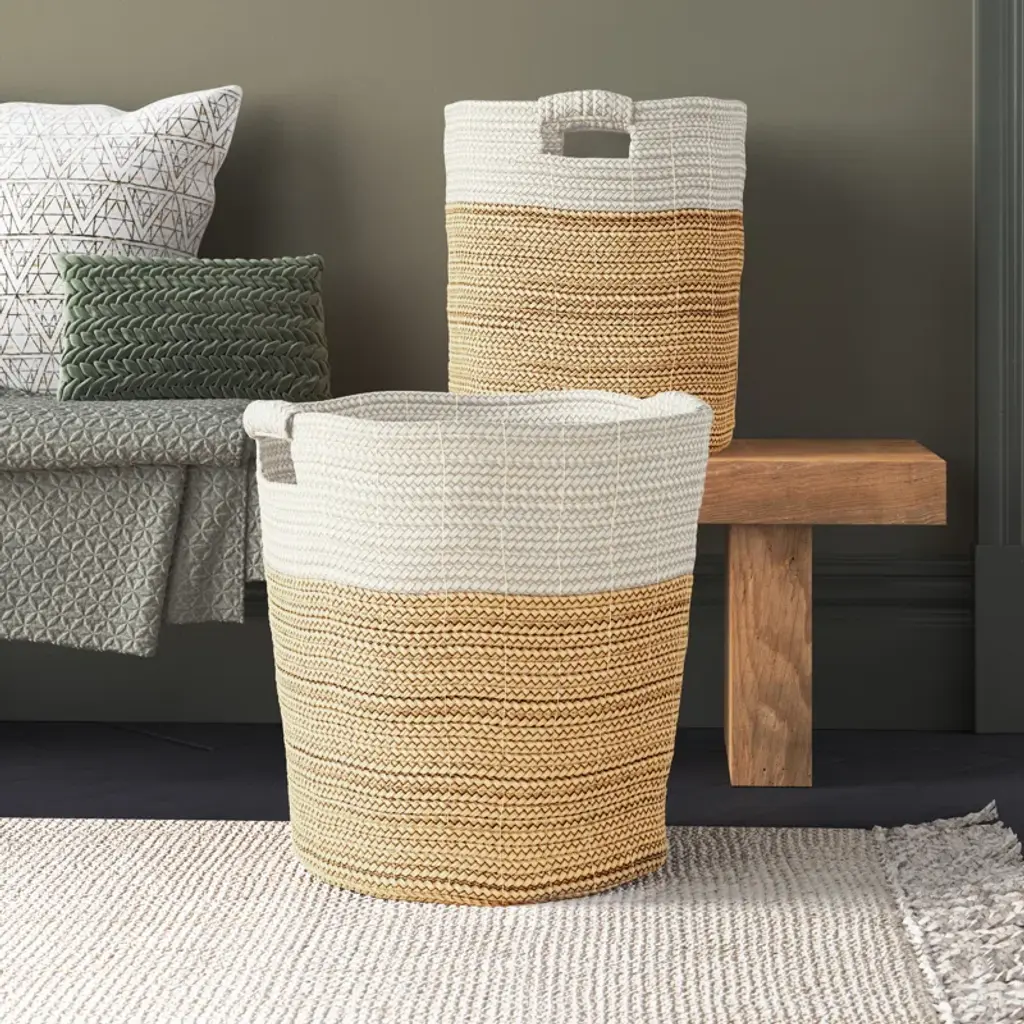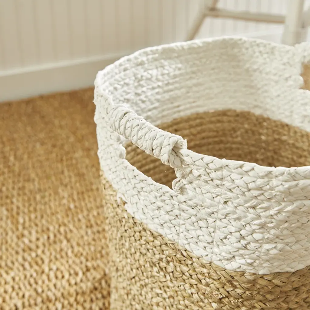 Fashion meets function. This set of two handmade seagrass baskets features a rich mix of white and tan colors, adding a breezy, coastal vibe to your storage game. Round in shape, these baskets are perfect for corralling clutter or for storing away everything from books and magazines to extra throw blankets and toys. We love that the convenient handles make them easy to transport, while the nesting design saves space when not in use. Plus, they're easy to maintain – simply dust with a soft cloth.