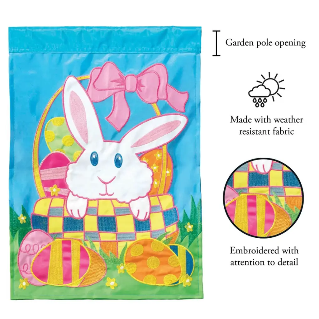 This garden flag by Magnolia Garden is designed with a combination of fabric appliques and exquisitely detailed embroidery on both the front and back; Flagpole sold separately. Features a cute bunny rabbit peaking out of an Easter Basket full of brightly painted eggs, spilling some onto the grass; The backside of the flag features the backside of the bunny in the same basket, making a great two-sided flag with some added adorable humor. Made of quality polyester double thickness material; These flags are heavier than most others on the market and will hold up for longer, They will retain its color and beauty for years if displayed in shade or semi-shade, and is rainproof; Measures approximately 13 inches wide and 18 inches tall. Perfect for displaying in a garden, on its own or as part of a garden display year-round; Fits most standard garden poles, sold separately; Care Instructions: Handwash in cold water, Air dry with no heat. Contained in protective packaging; Ready for easy gifting for a housewarming, birthday, or any special occasion