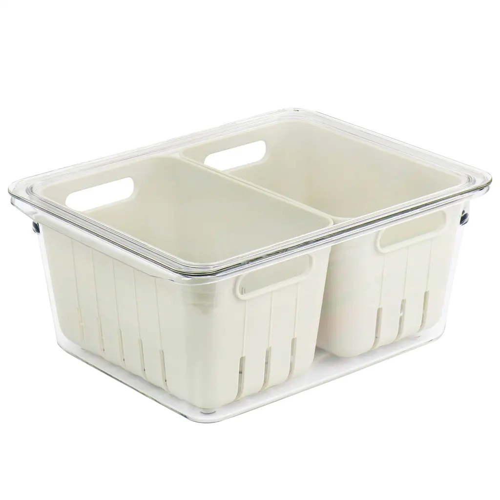 This Martha Stewart Fresh Keeper Container is the perfect container when you need to keep food well ventilated and well contained. This set comes with dual removable baskets and an outer container. The removable baskets can act as colanders to wash produce, while the elevated bottom promotes airflow and a space for liquid drainage to prevent spoiling. The dual basket design is perfect for storing small produce separately; easily store grapes and berries in one container and save some space! This Dual function set can be used as one piece or separated and saves you space with its stackable storage design! Hand Wash Only Material: Plastic (BPA Free) Color: Clear/Beige Elevated Bottom Promotes Airflow Stackable Space Saving Design Two Removable Colander Baskets for Dual Functionality Set Includes: Two Removable Colander Baskets One Plastic Container One Lid Item Measurements: Colander Baskets: 6in length, 3.8in width, 3.5in height, 0.15lb weight Storage Bin with Lid: 8.8in length, 6.7in width, 3.9in height, 0.75lb weight