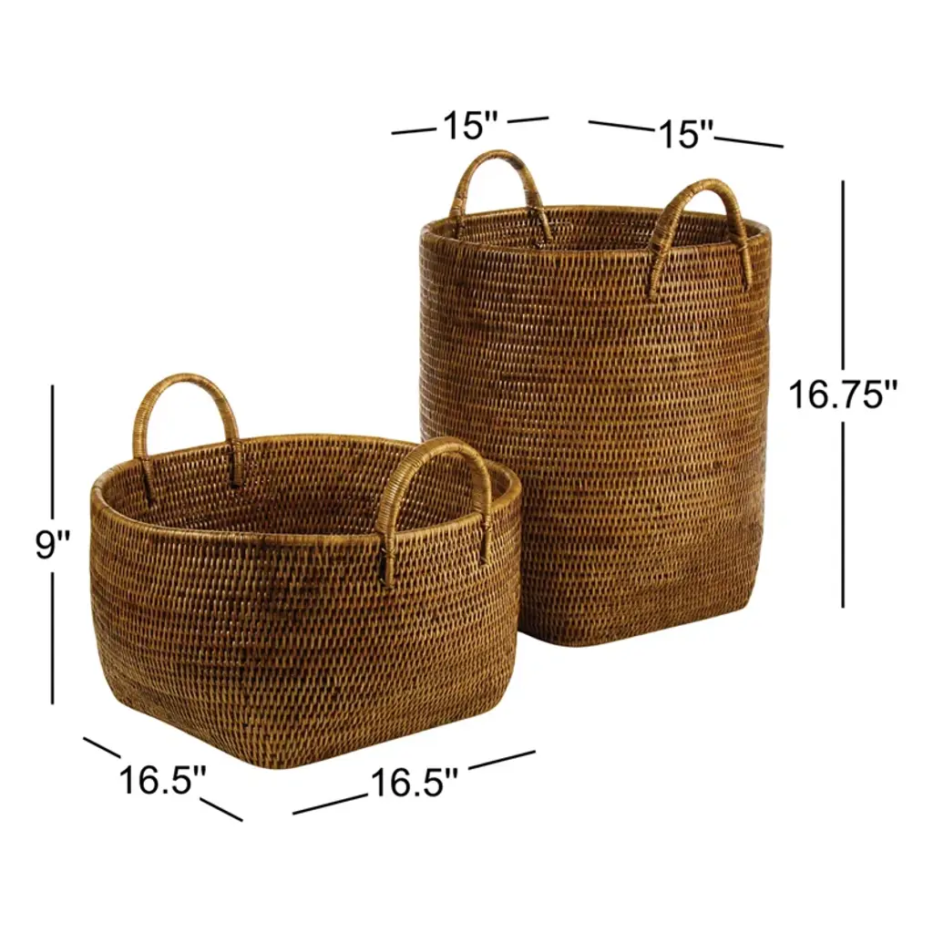 Bring breezy style and storage to any space with this set of two baskets. Perfect for holding magazines, throw blankets, and beyond, this set includes one short basket and one large basket. Woven from rattan, each design sports a natural brown finish that blends easily with a variety of color palettes and aesthetics. Handles make it easy to transport these baskets between rooms.