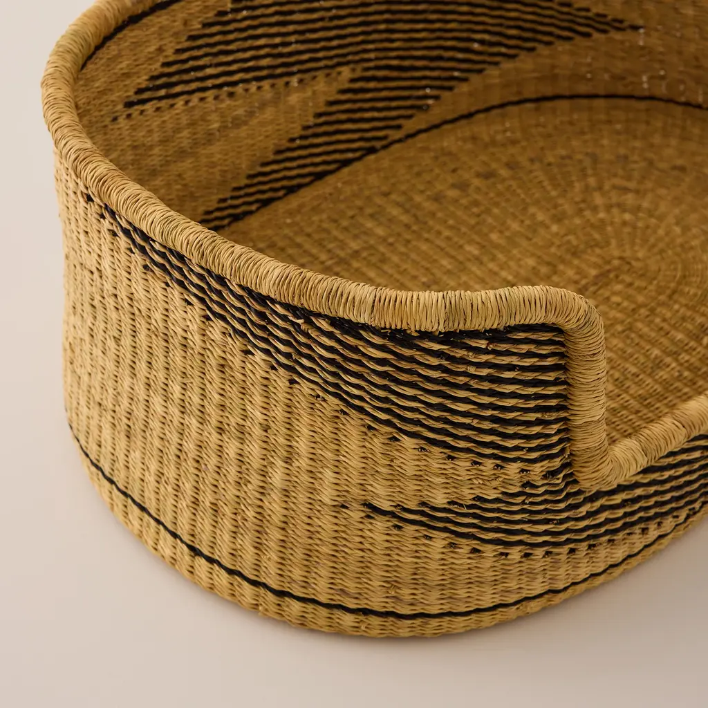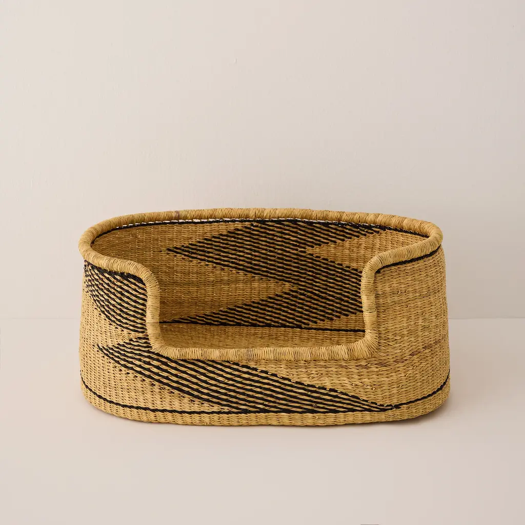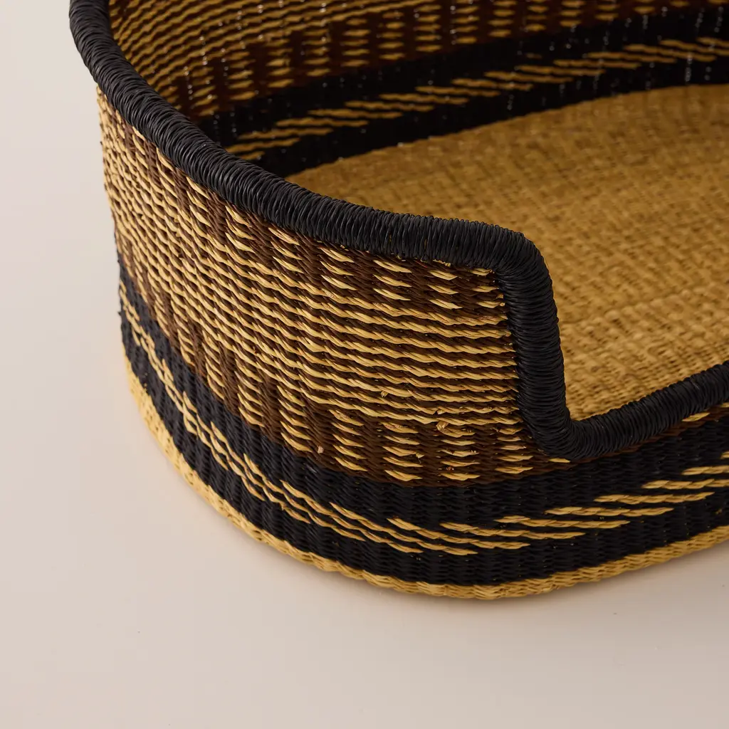 Give your furry friend a cozy spot to call their own with our medium-sized Baba Tree Medium Dog Bed Basket. Perfect for small to medium breeds such as Pugs, Beagles, and Boston Terriers, it offers comfort and security with its raised sides. Expertly handcrafted by Baba Tree's artisans in Ghana from natural elephant grass, this bed isn't just a sleeping spot — it's a piece of functional basket art that brings an elegant touch to your home, blending durability, balance, and style for your pet's peaceful haven. Like every Baba Tree item, this basket is made under ethical working conditions, ensuring each artisan receives a meaningful income from their exquisite workmanship. * Mattress not included with the Baba Tree Medium Dog Bed Basket.
