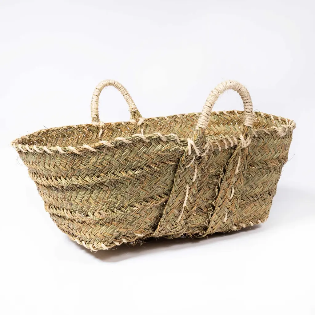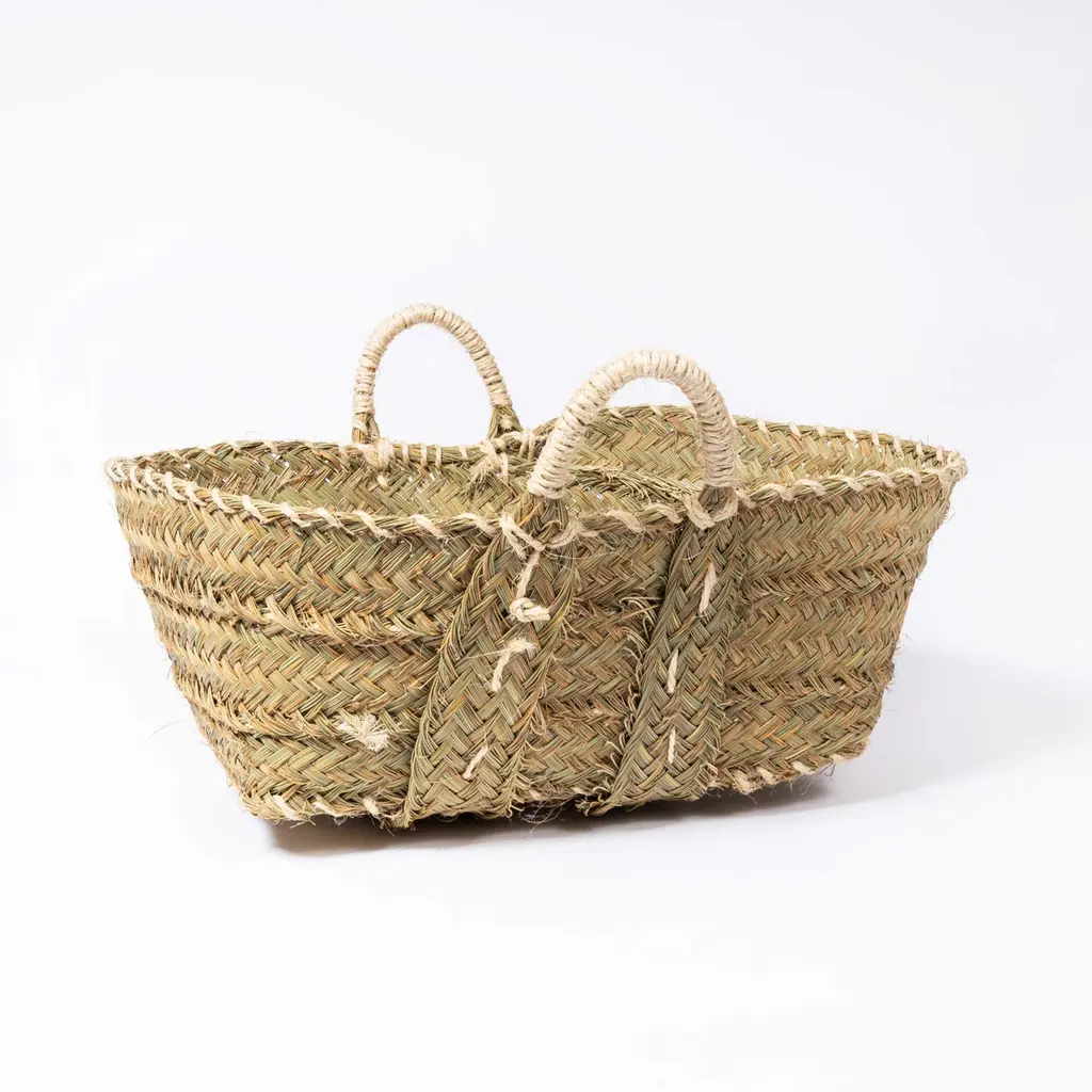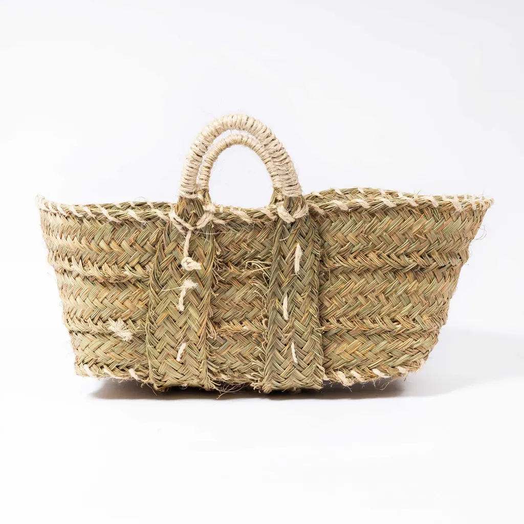 Medium Low Carry Basket - Esparto Grass. Woven for us on the western coast of Morocco using the distinct coarse vegetable grass Esparto.Workshop Report:Contemporary product woven by hand in Morocco.Date:21st CenturyMaker:Handmade - MoroccoDimensions:61cm(w) x 57cm(l) x 31cm(h)
