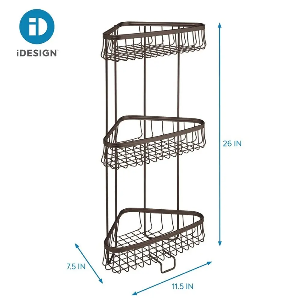 STYLISH SHOWER: Three metal wire racks allow for water drainage while storing towels, shampoo, soap, razors, loofahs, and creams securely in or right outside your shower. Great for master, kids, or guest bathrooms VERSATILE: Use inside your shower to hold bath accessories or on the bathroom floor to store toilet paper, toiletries, hair accessories, tissues, cleaning supplies, cosmetics, and more DURABLE: Strong steel construction is rust resistant and stays looking new for years of quality use STYLISH: Neutral bronze finish matches any decor style IDEAL SIZE: Measures 11.5" x 7.5" x 25.75", the perfect size for the corner of your shower or bathroom