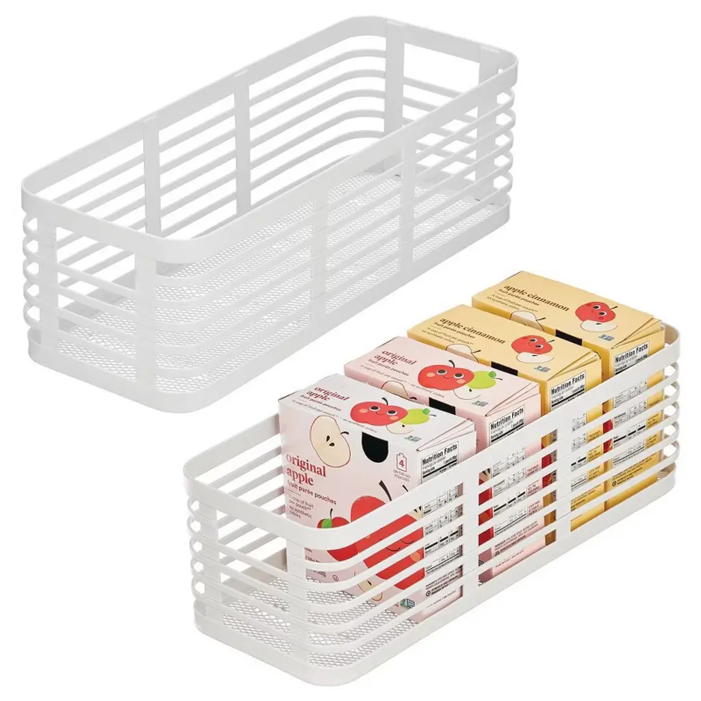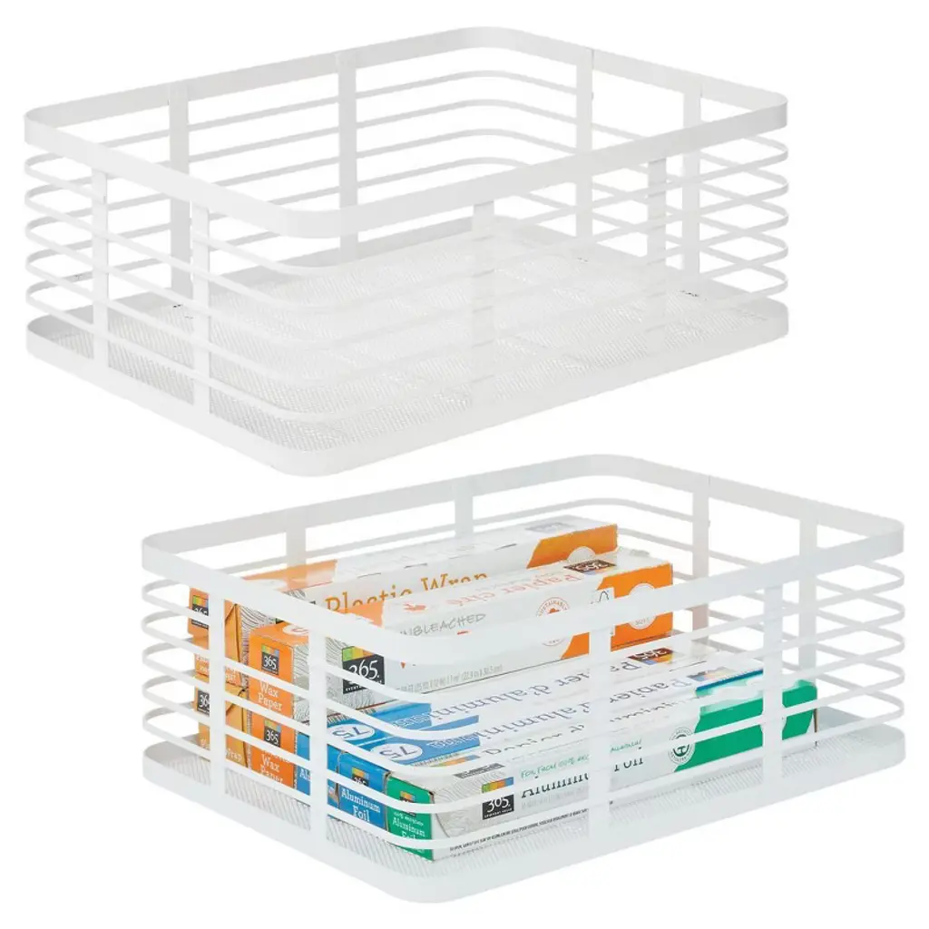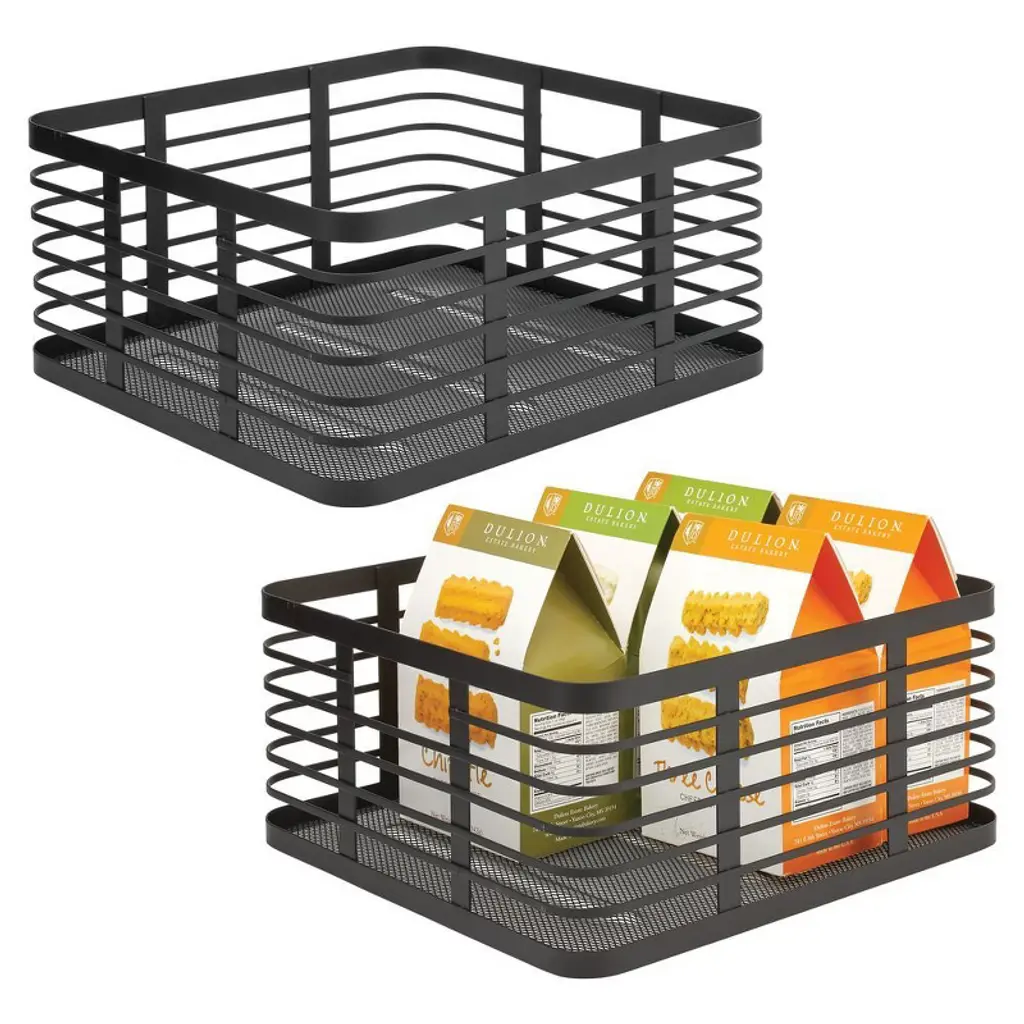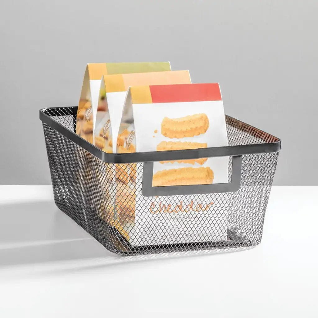 Enjoy quick access to your preferred ingredients with the Metal Mesh Pantry Basket, turning recipe card favorites into culinary delights. Sleek and highly versatile, this solution corrals small seasoning jars, snacks, or boxed foods so you never lose anything to the back of the pantry again. The metal mesh design and open-top concept allow for proper air circulation when storing fruits and vegetables and easy visibility to quickly inventory items inside without rummaging. Crafted from durable metal with built-in handles, these baskets transport easily and make a darling display when moved from the pantry to the countertop or kitchen table.