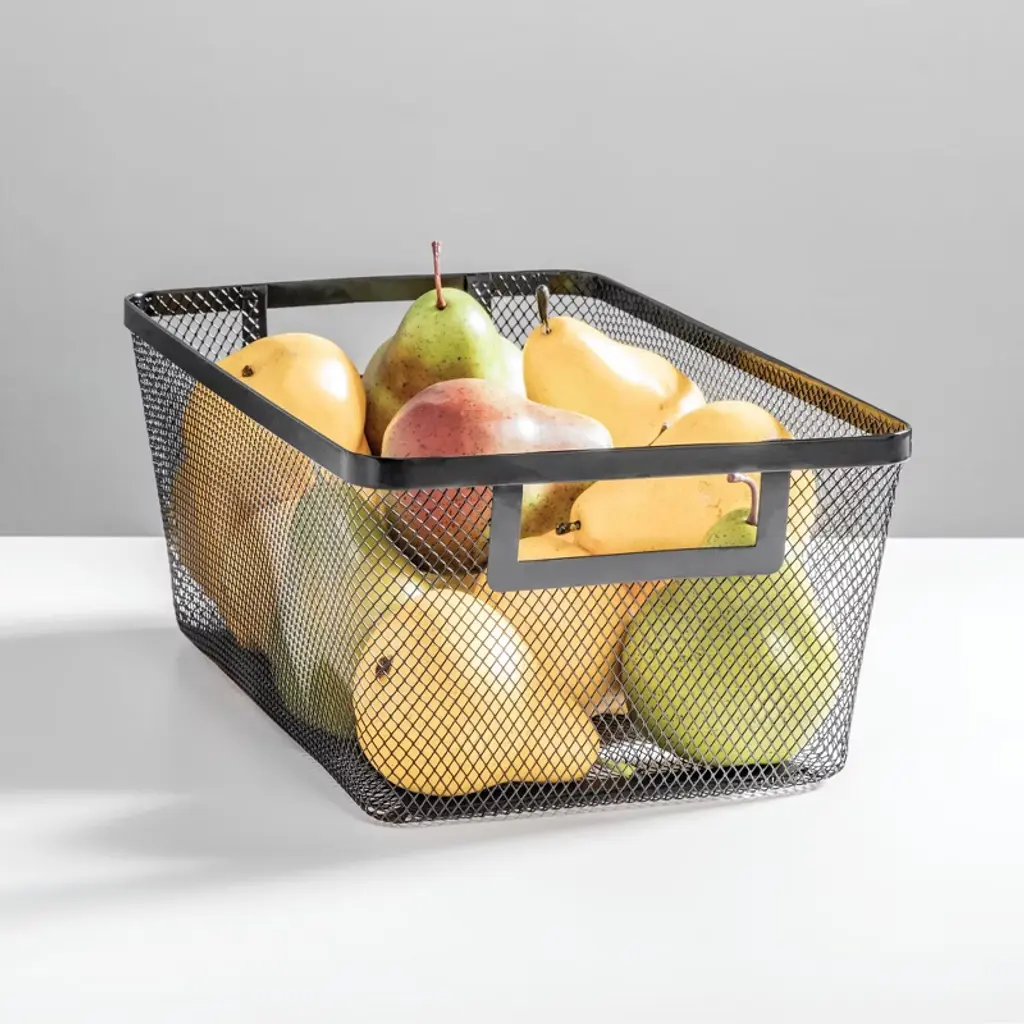 Enjoy quick access to your preferred ingredients with the Metal Mesh Pantry Basket, turning recipe card favorites into culinary delights. Sleek and highly versatile, this solution corrals small seasoning jars, snacks, or boxed foods so you never lose anything to the back of the pantry again. The metal mesh design and open-top concept allow for proper air circulation when storing fruits and vegetables and easy visibility to quickly inventory items inside without rummaging. Crafted from durable metal with built-in handles, these baskets transport easily and make a darling display when moved from the pantry to the countertop or kitchen table.