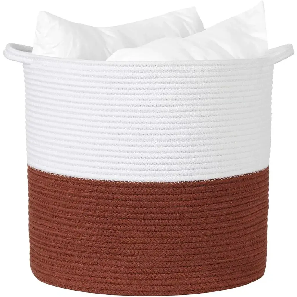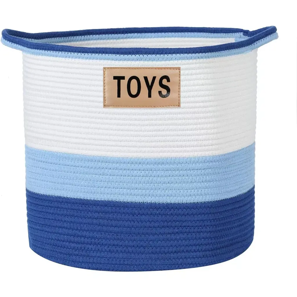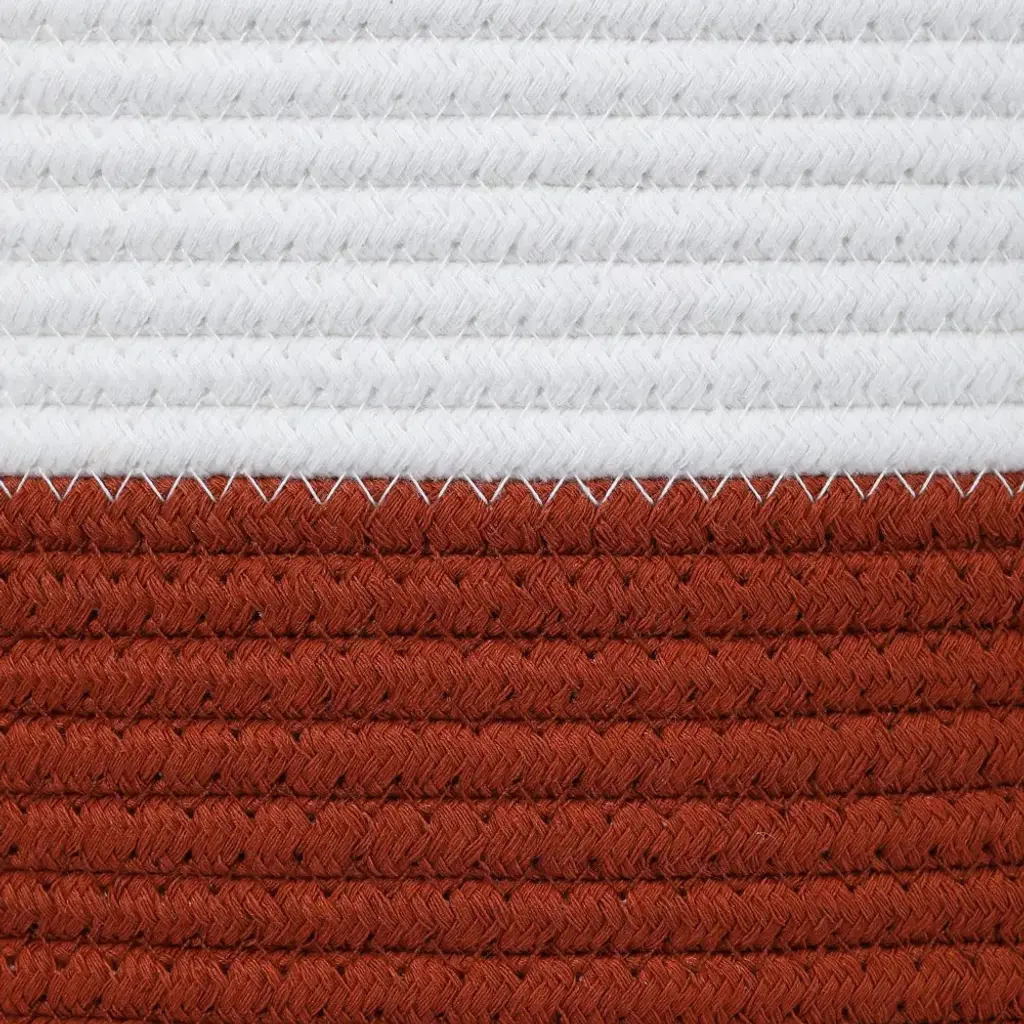 16" x 14". Large sized basket. Whether you are looking to store baby or pet toys, this rust rope storage basket will integrate nicely into your home. Trendy rust colored bottom with classic white top and a brown TOYS label, this basket will look great in a nursery or living room. Ships flat, stuff with blankets for a day to help it regain its shape.