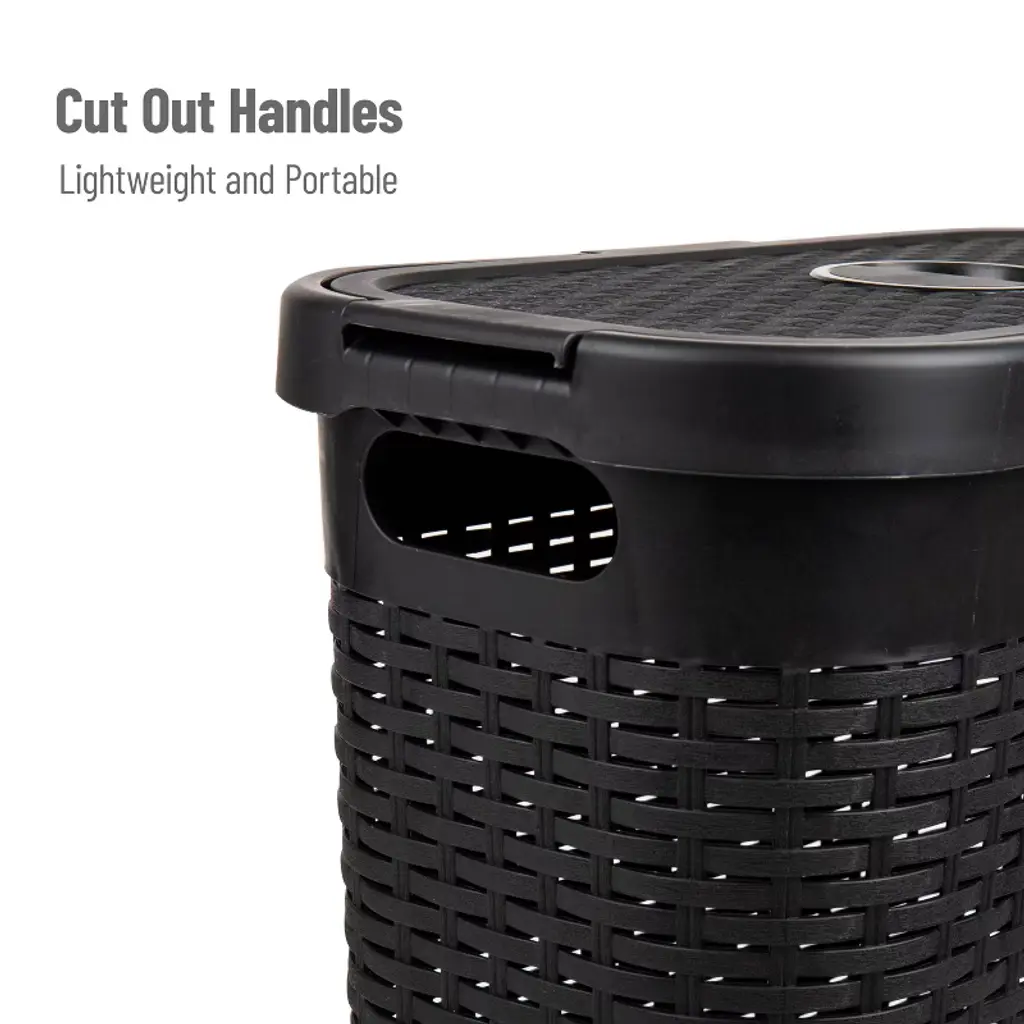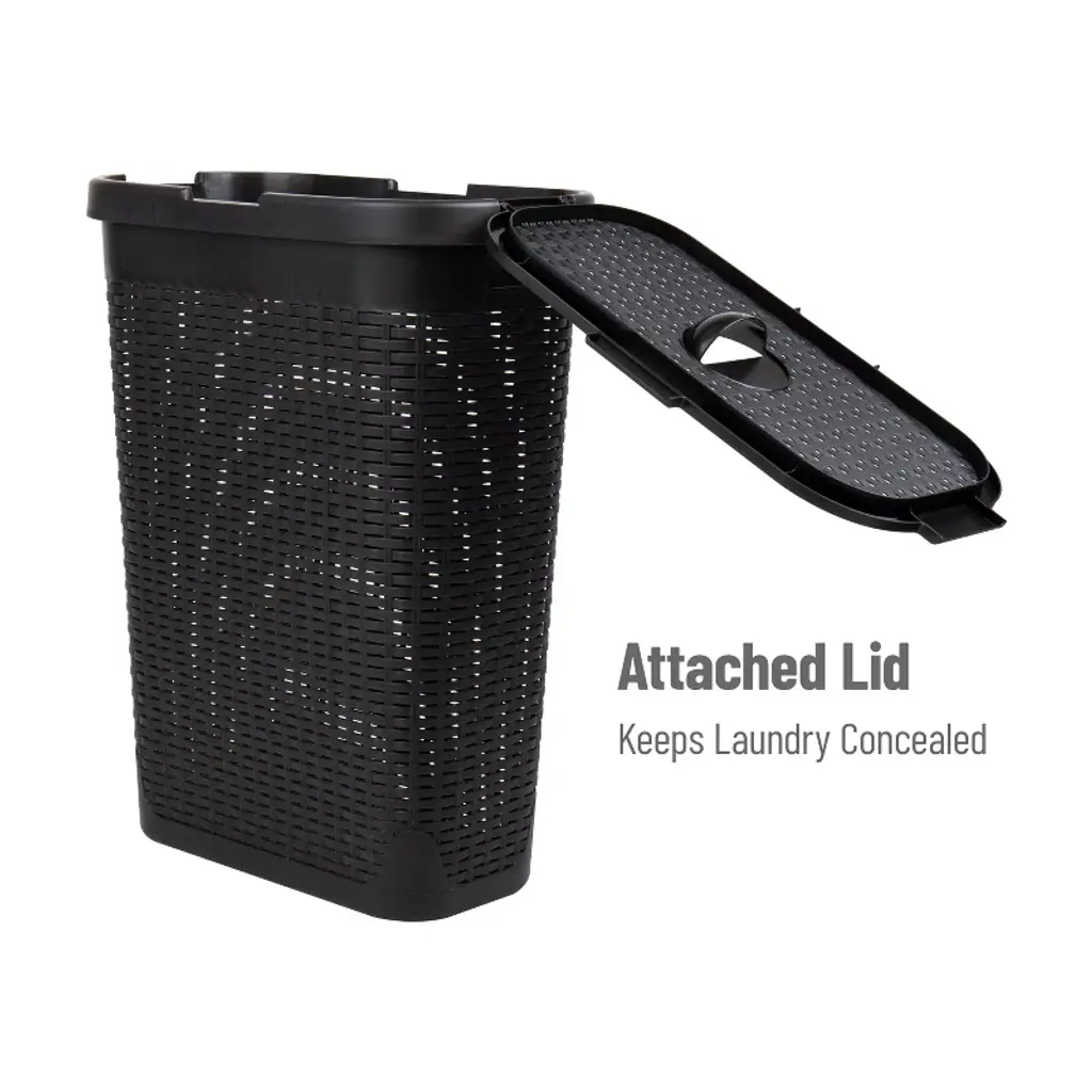 Versatile Laundry Hamper with Premium Wicker Design Tackle your clothes clutter with this set of three stylish and durable laundry hampers. With the capacity to securely hold up to 40 liters (15kg/33lb) of clothes or linens, this hamper is not just practical but also adds a touch of elegance to your space. Its slender, tapered design allows it to fit comfortably in various spaces, such as next to your washer, shower, or within a closet. Crafted with a premium wicker design, this hamper facilitates ventilation, allowing your garments to breathe. The hinged lid is easy to snap into place upon arrival, keeping your laundry out of sight. This hamper is not just for laundry; it's also an excellent solution for storing seasonal clothing, thus maximizing your closet space. Furthermore, its lightweight construction, complemented by the cut-out handles, makes it easy to carry even when full. It's perfect for transporting laundry to the laundry room, laundromat, or for college kids bringing home laundry on weekends. But the versatility of this hamper goes beyond laundry. It can also be used to store toys, sports equipment, crafting supplies, out-of-season clothes, or shoes, extending your storage possibilities. Cleaning up has never been easier with this versatile laundry hamper.