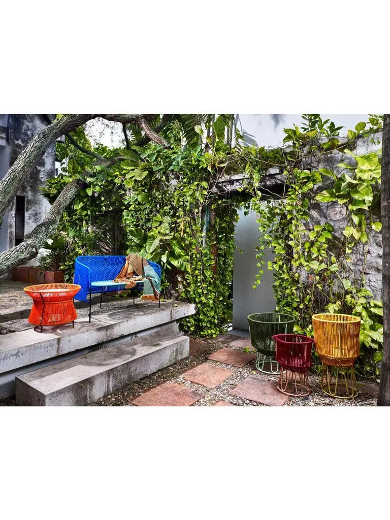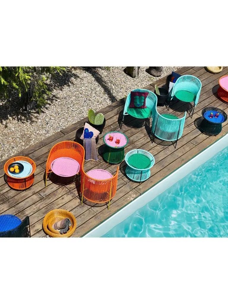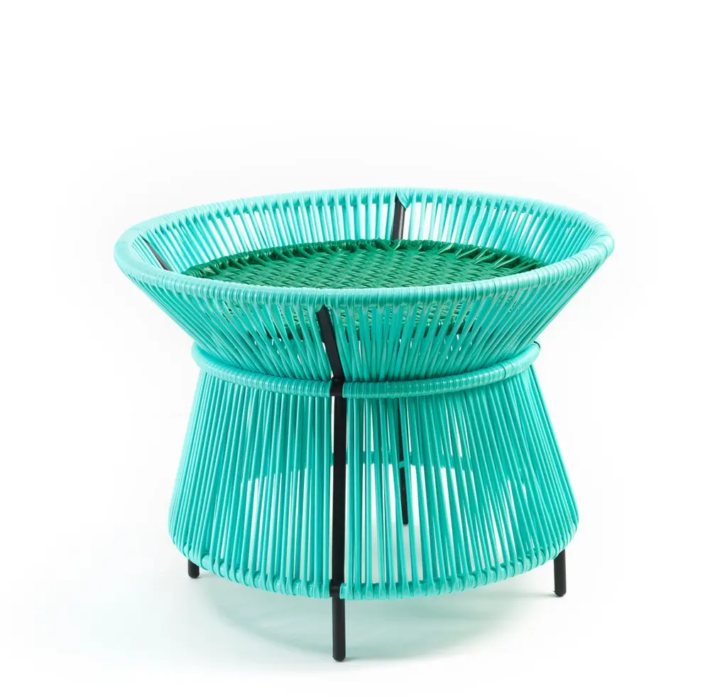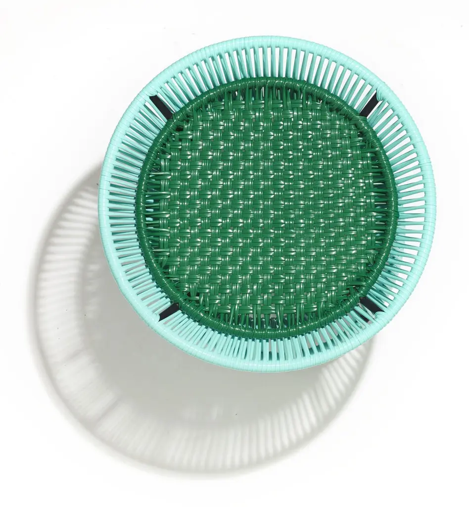 Mint caribe basket table by Sebastian HerknerMaterials: Galvanized and powder-coated tubular steel. PVC strings are made from recycled plastic.Technique: Made from recycled plastic and weaved by local craftspeople in Colombia. Dimensions: Diameter 54.1 x Height 41 cm Also available colors: blue/ mint/ black, mint/ green/ black, orange/ rose/ curry, green/ rose/ curry. The charming caribe basket table is a colorful companion for seating arrangements inside and outdoors. It’s part of the Caribe collection, designed by Sebastian Herkner for ames. The German designer visited Colombia together with Ames founder Ana Maria Calderon-Kayser and translated the vibrancy and spirit of the country’s people and traditions into joyful, modern furniture pieces defined by clean lines, strong colors, and the hand-woven webbing.Each basket is made in Santa Marta, a city on the Caribbean coast of Colombia, by local craftspeople. They weave the PVC strings, which are made from recycled plastic, around the tubular steel frame. The weaving technique the artesanos and artesanas use are called Momposino, a traditional method known for intricate patterns. Just the preparation of all the materials takes ten days, while the production of each table takes two daysGerman designer Sebastian Herkner is a long-term collaborator of Ames and has visited Colombia multiple times to experience the country’s cities, nature and people first hand. He also visited many of the ateliers that Ames has partnered with to learn about the unique traditional crafts of Colombia's regions. A sought-after contemporary designer and recipient of many industry awards, he has worked with many international design brands, creating intriguing pieces that showcase his intuition for interesting material, color, and texture combinations.