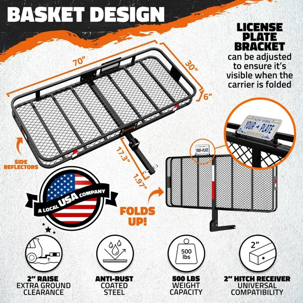 Mockins 70"x30"x6" Xxl Trailer Hitch Cargo Carrier Hitch Mount | 500lbs Cap. Hitch Basket With 40 Cf Bag & Foldable Arm