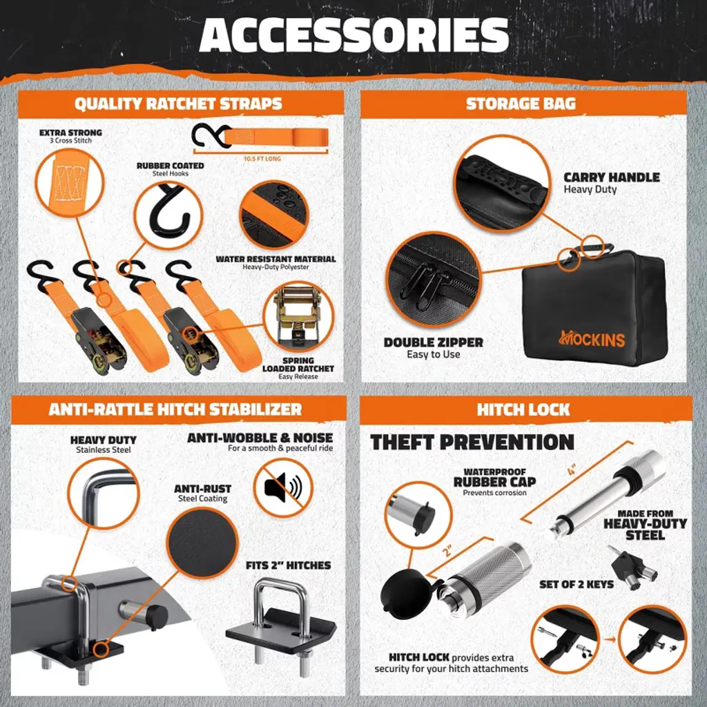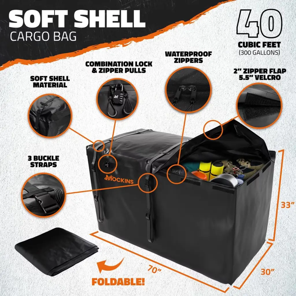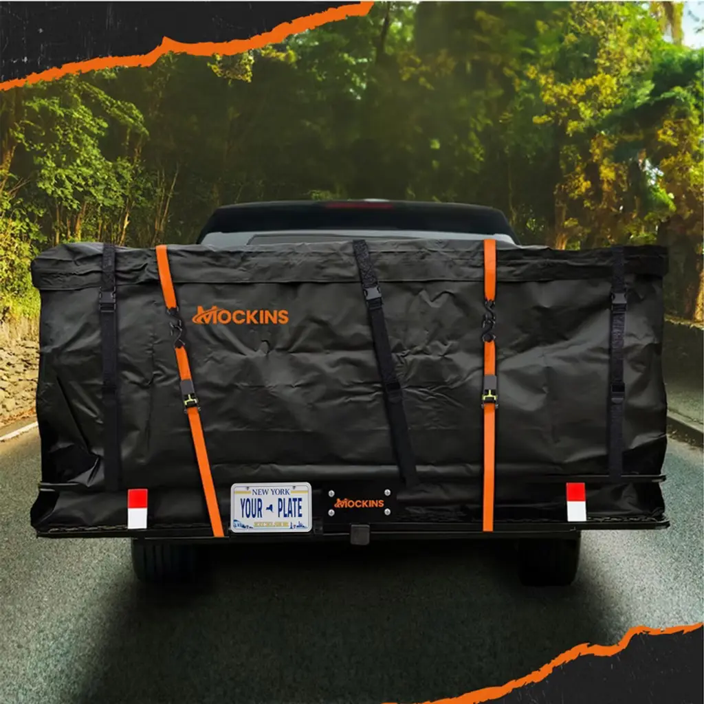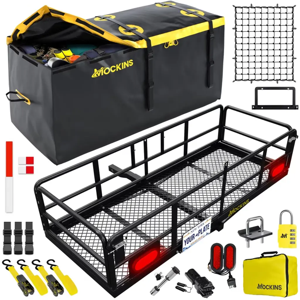 The Mockins Deluxe Hitch Cargo Carrier bundle is expertly designed to transport large and irregular payloads without the hassle. Providing a substantial 500 lbs. capacity with 6” high side rails, this hitch cargo rack handles everything from luggage and camping gear to appliances and construction materials. The built-in license plate holder provides peace of mind in instances where your cargo obstructs the rear of your vehicle. The package also includes a 70" x 30" x 33" (40 Cu.Ft.) weatherproof vinyl hitch cargo bag with a waterproof zipper to protect your belongings, as well as straps and a luggage lock to keep everything secure. For those in need of a dependable, heavy-duty car rack, the Mockins Hitch Cargo Carrier is the answer!