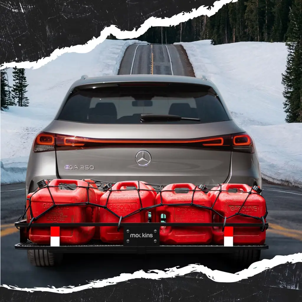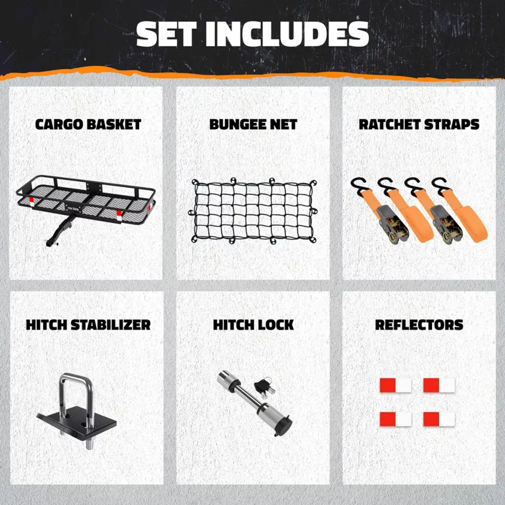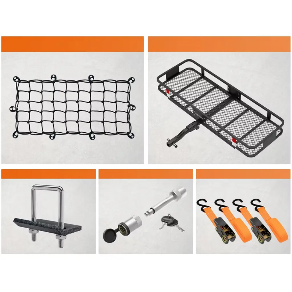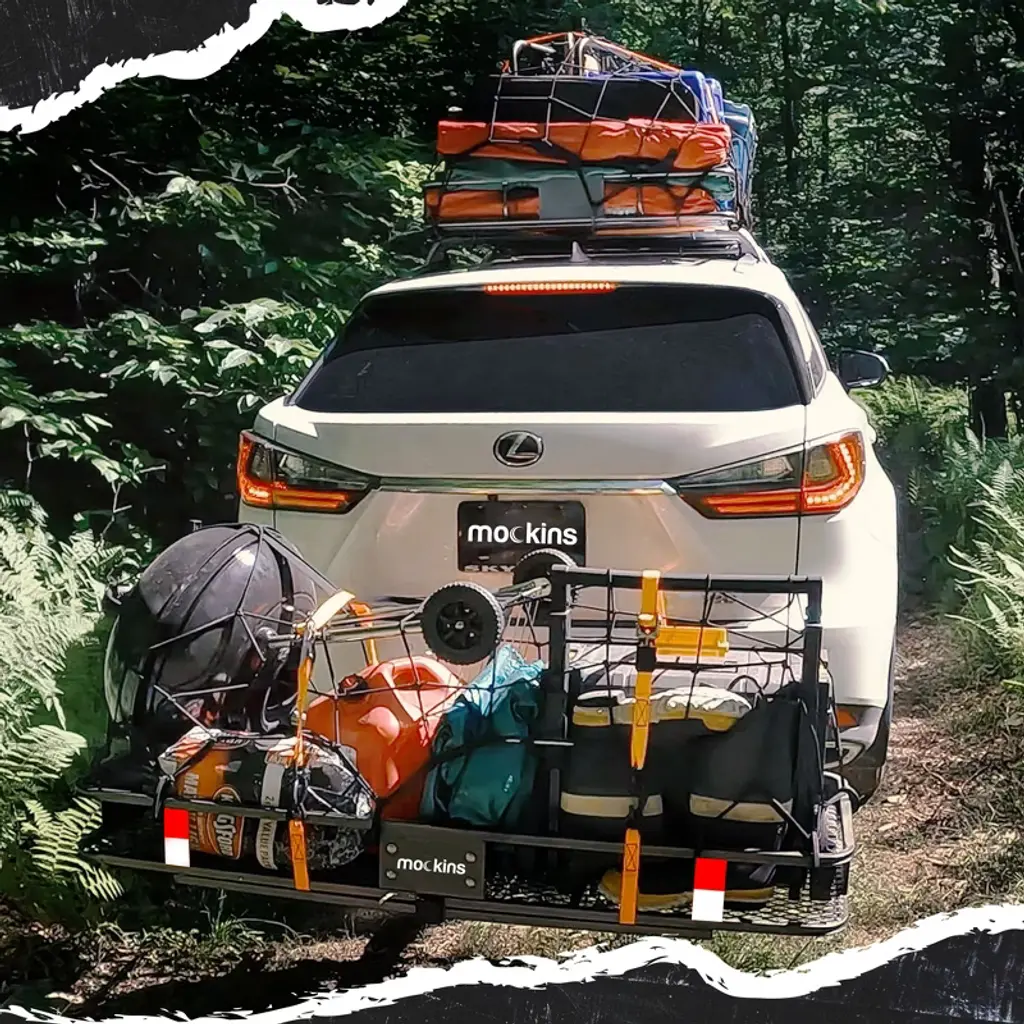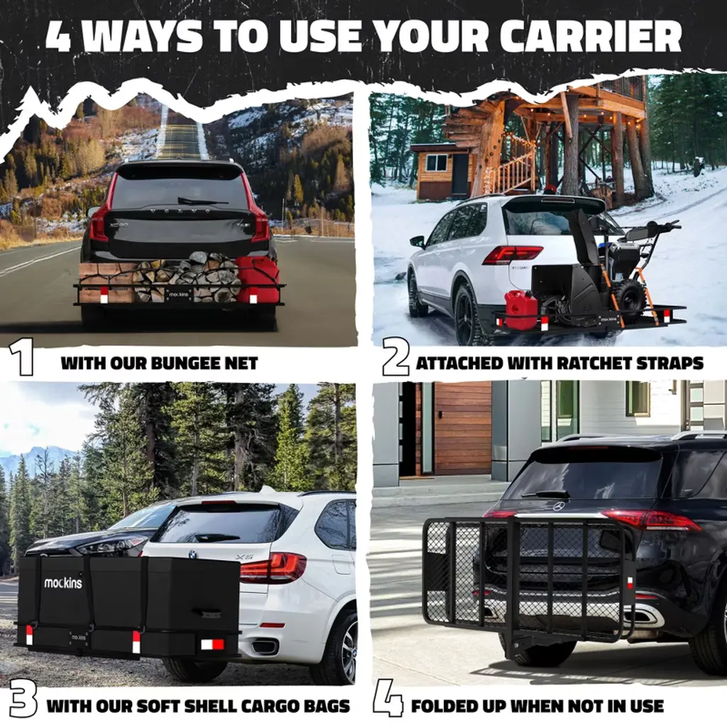 The Mockins Hitch Mount Cargo Carrier Rack was designed with your convenience in mind! A 2" hitch raise will ensure sufficient ground clearance and the 60"Lx20"Wx6"H cargo basket can haul a hefty 500 lbs., so you can easily transport machinery or luggage without making your vehicle dirty or losing precious legroom! The basket can easily be removed or folded up towards the vehicle when not in use, and can be used with a Mockins 16 cubic foot rainproof cargo bag to further protect your luggage. The hitch mount cargo carrier accessories include a hitch stabilizer, hitch lock, ratchet straps and bungee net. The heavy duty stainless steel hitch stabilizer will help reduce wobble throughout the drive and has an anti-rust coating for long-term use, it is universally sized to fit 1.25" and 2" hitches. The hitch lock provides extra security for your hitch attachments and features a waterproof rubber cap to prevent corrosion. The heavy-duty water resistant ratchet straps feature an extra strong, 3-cross-stitch sewing and were designed with rubber coated steel hooks and an easy release spring loaded latch for durability and ease of use. The 4x4" mesh bungee net stretches from 20x36" to 40x84", to accommodate loads of many shapes and sizes, so you can load up and go in no time!
