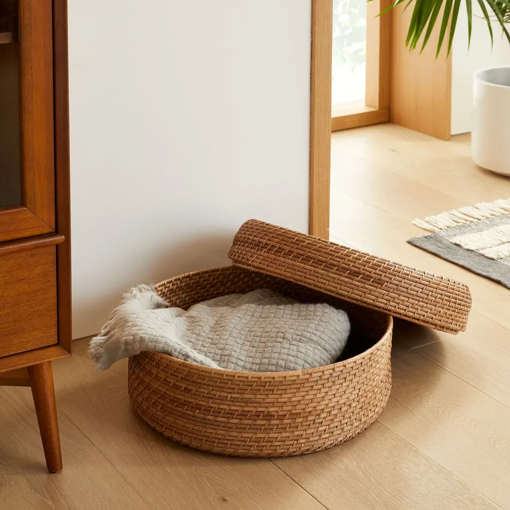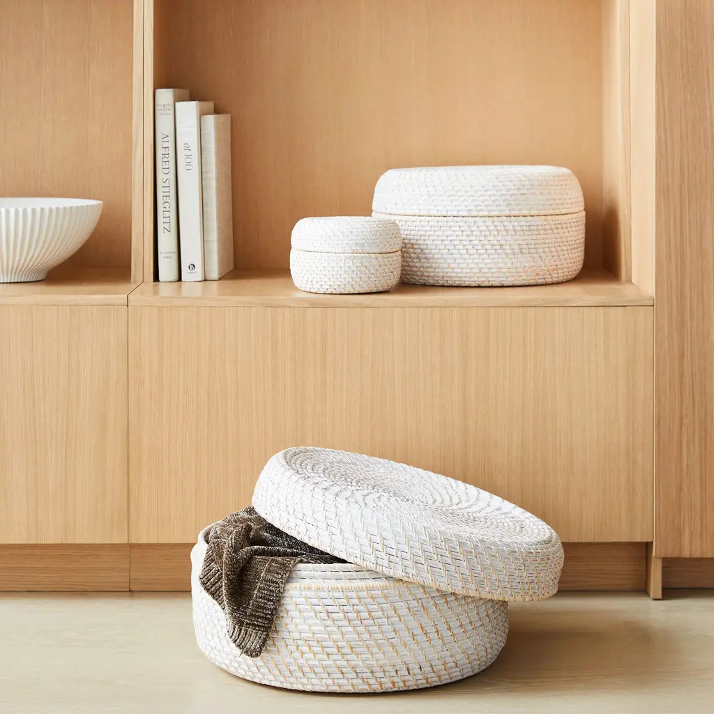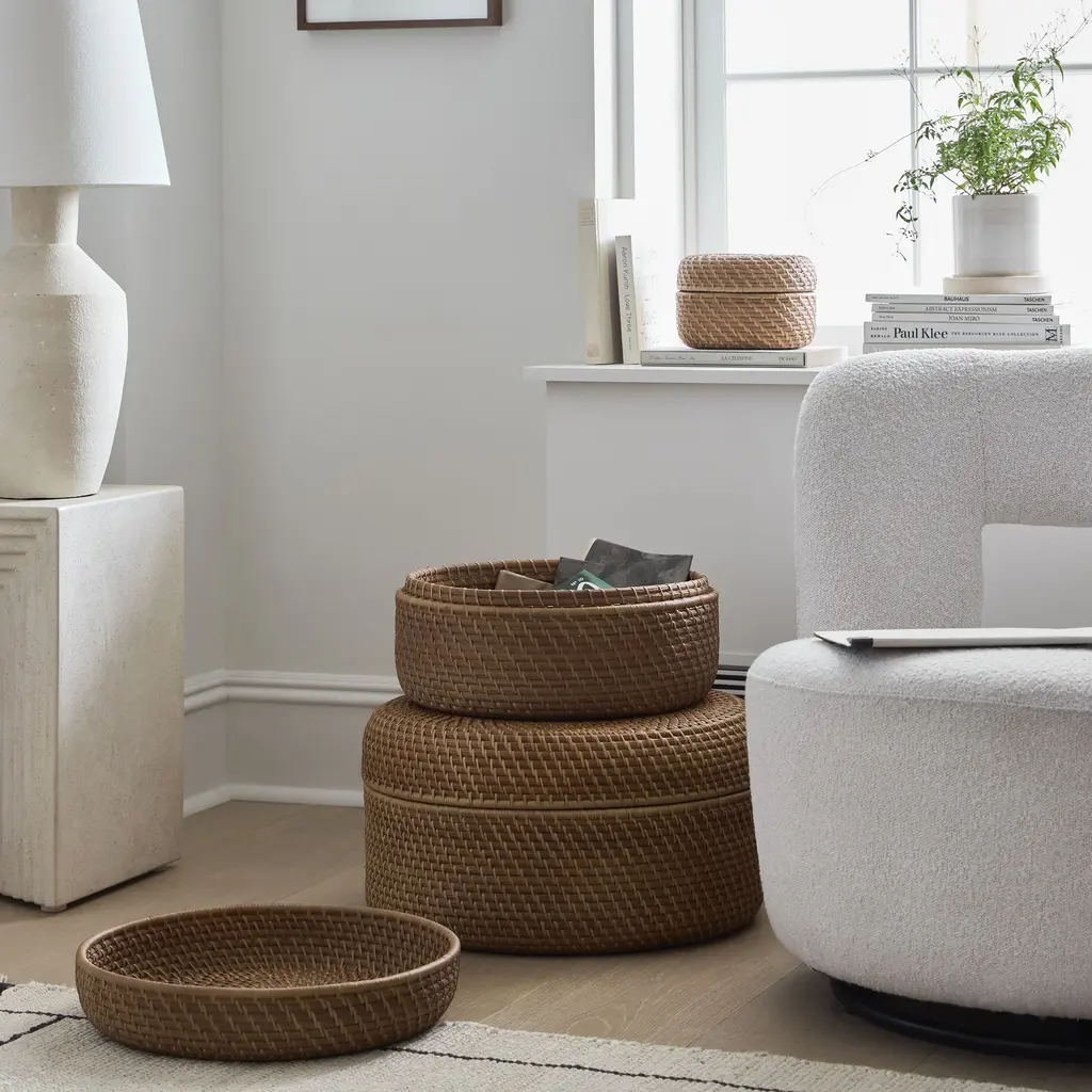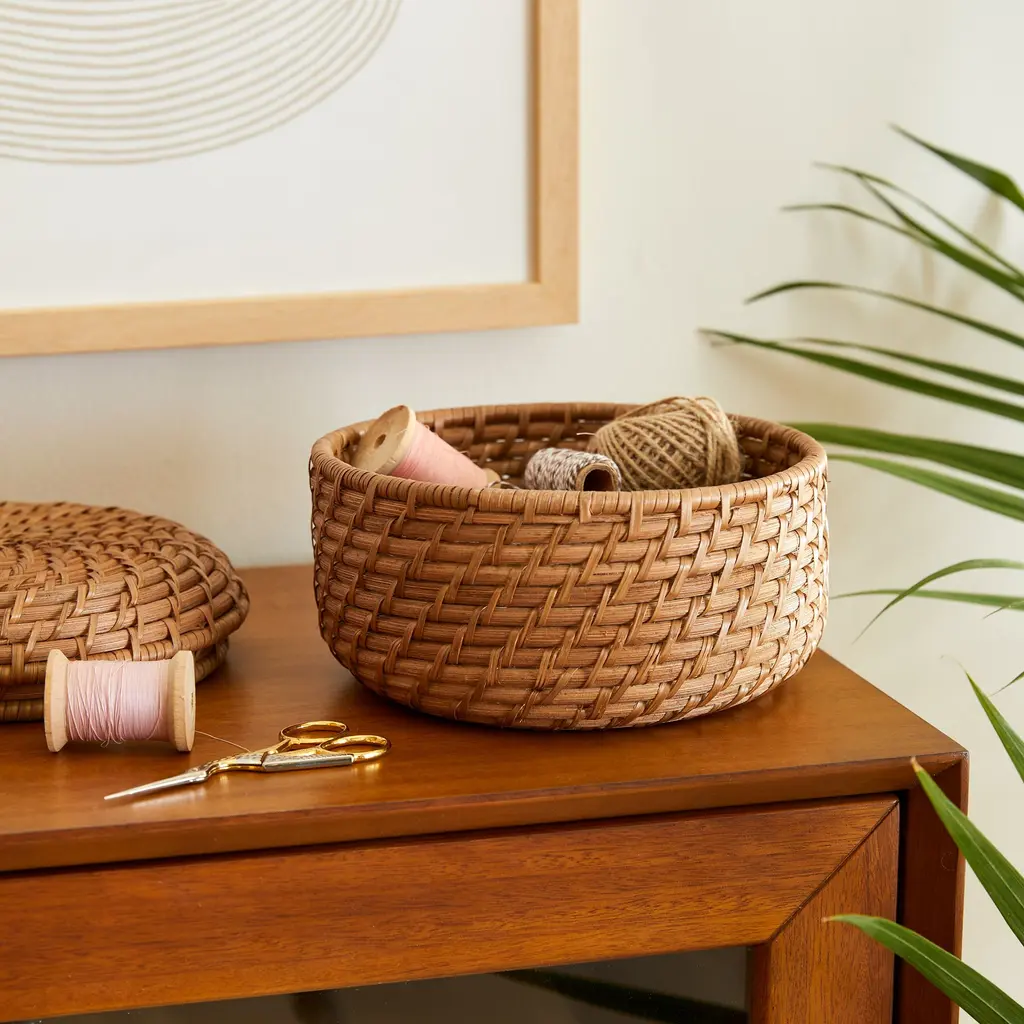 Sturdy storage for items big and small. Natural rattan adds warm texture to your space. Each is handwoven by artisans.