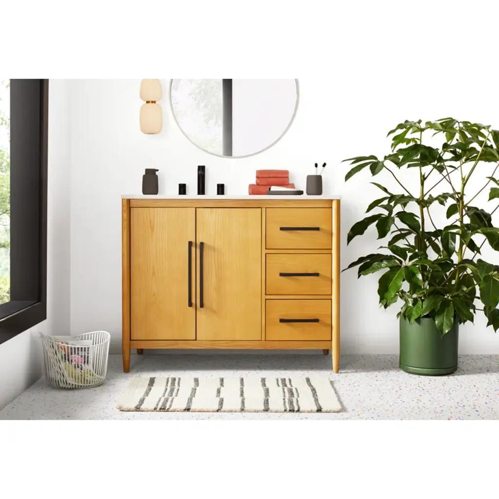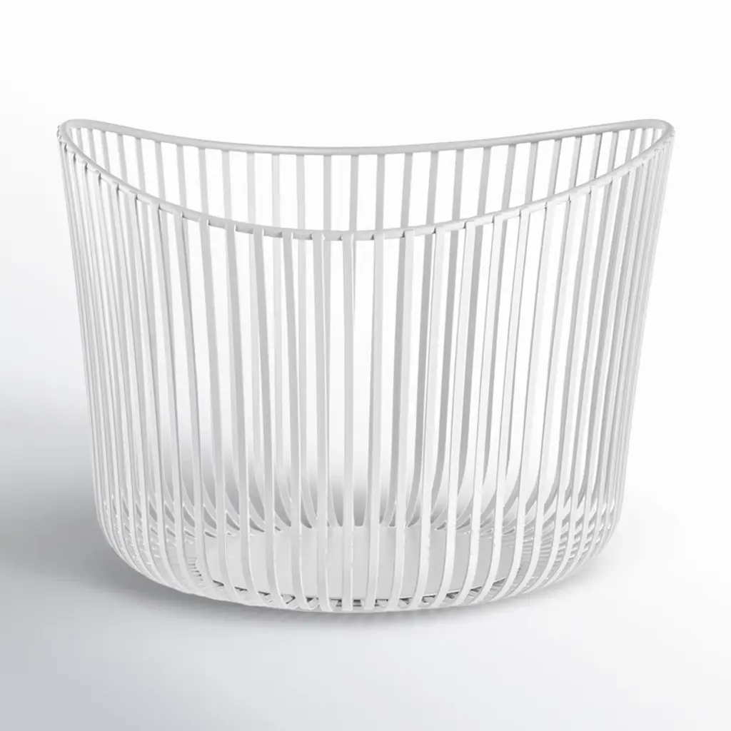 Complete your space. This bathroom storage basket holds hand towels, soaps, or shower accessories, and its open design allows damp items to dry off. It’s built from powder-coated steel, with a sleek neutral finish + rounded silhouette that work in the kitchen or entryway too.