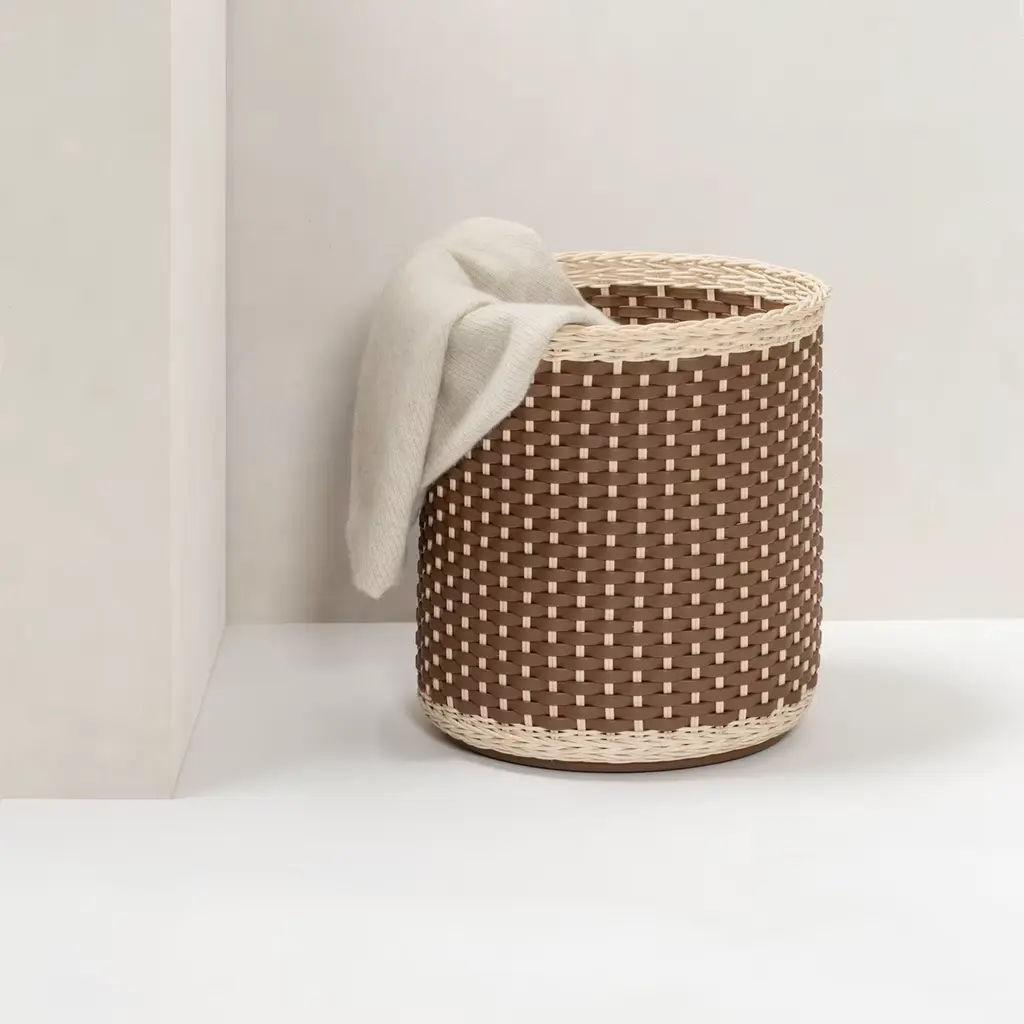 A testament to traditional craftsmanship and the subtle elegance of raw materials, this storage basket will make a refined addition in any decor. Boasting a versatile cylindrical-shaped silhouette, it is entirely handwoven of natural rattan and brown leather, creating a visually striking design of timeless sophistication. This piece is available with Napa leather, please contact the Concierge for details.