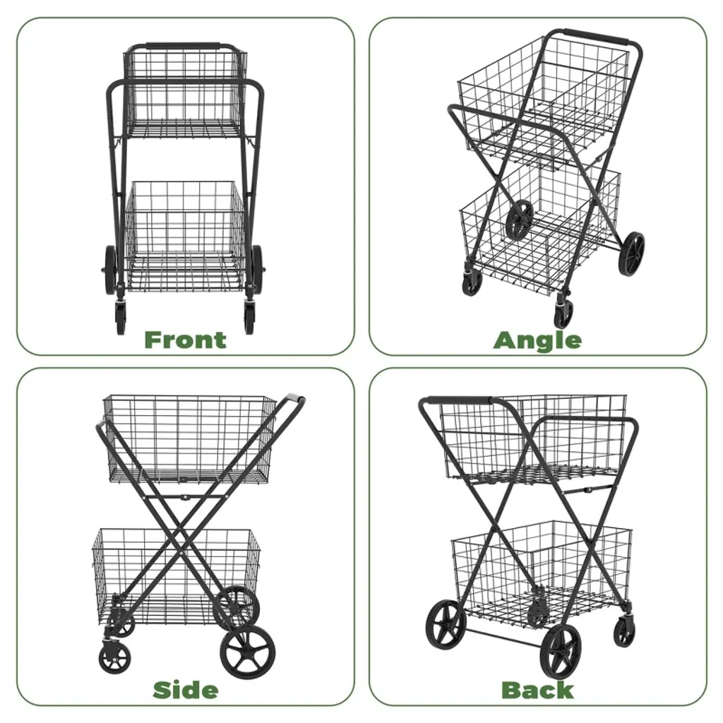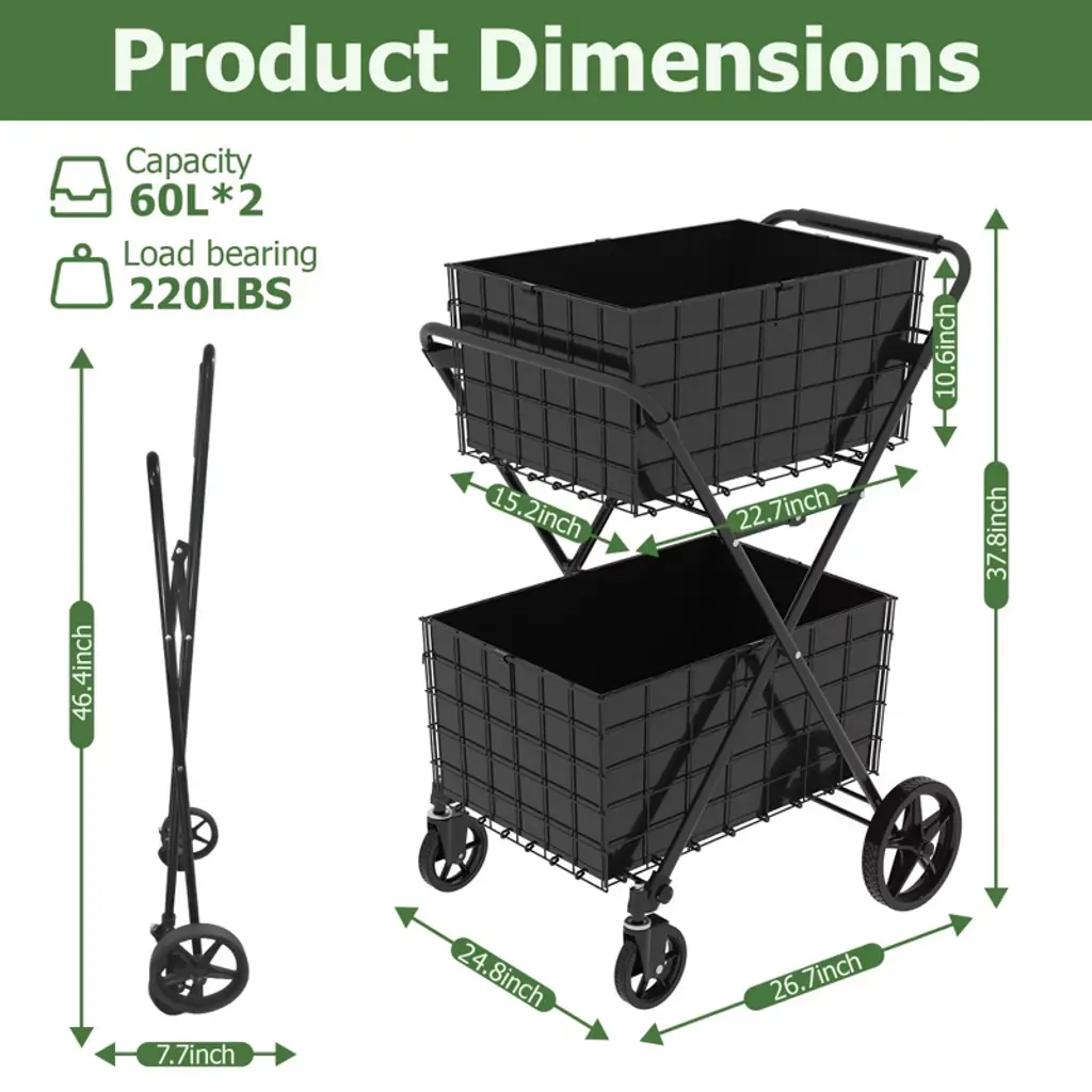 Naysaye Foldable Utility Dolly 2 Tier Jumbo Grocery Cart With Double Baskets And Swivel Wheels For Home Use, Black, 43.3"*20.8"*2.9"