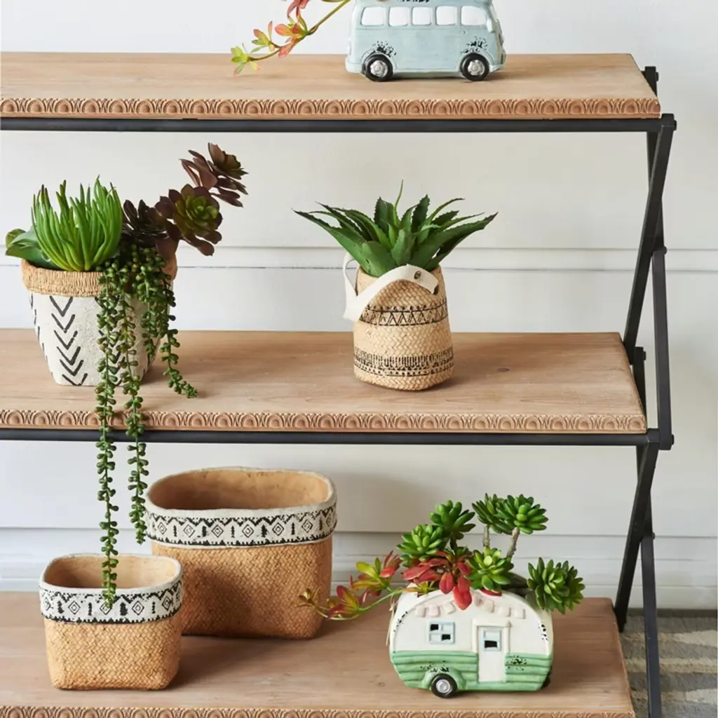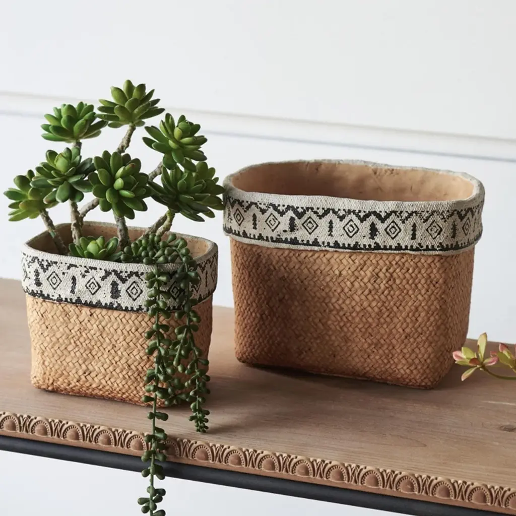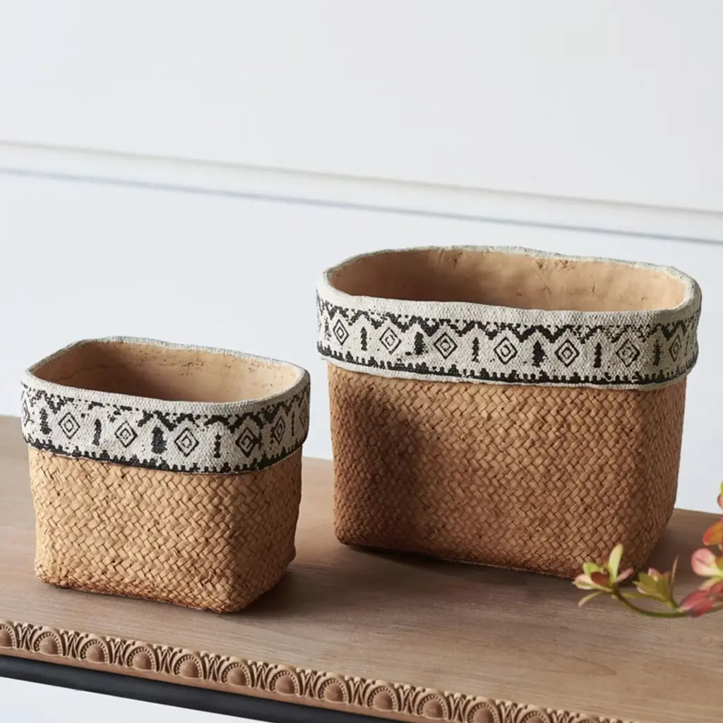 NAYSAYE Planters Set of 2 Rectangular Basket Planters with Geometric Trim for Indoor Outdoor Use Bring rustic charm to any space with these rectangular basket planters. The bold black and white geometric trim contrasts with the natural cement body, adding a modern touch. Ideal for both indoor and outdoor settings, these durable planters provide ample space for multiple plants. A perfect addition to gardens, patios, or interiors, adding lasting style to any environment.