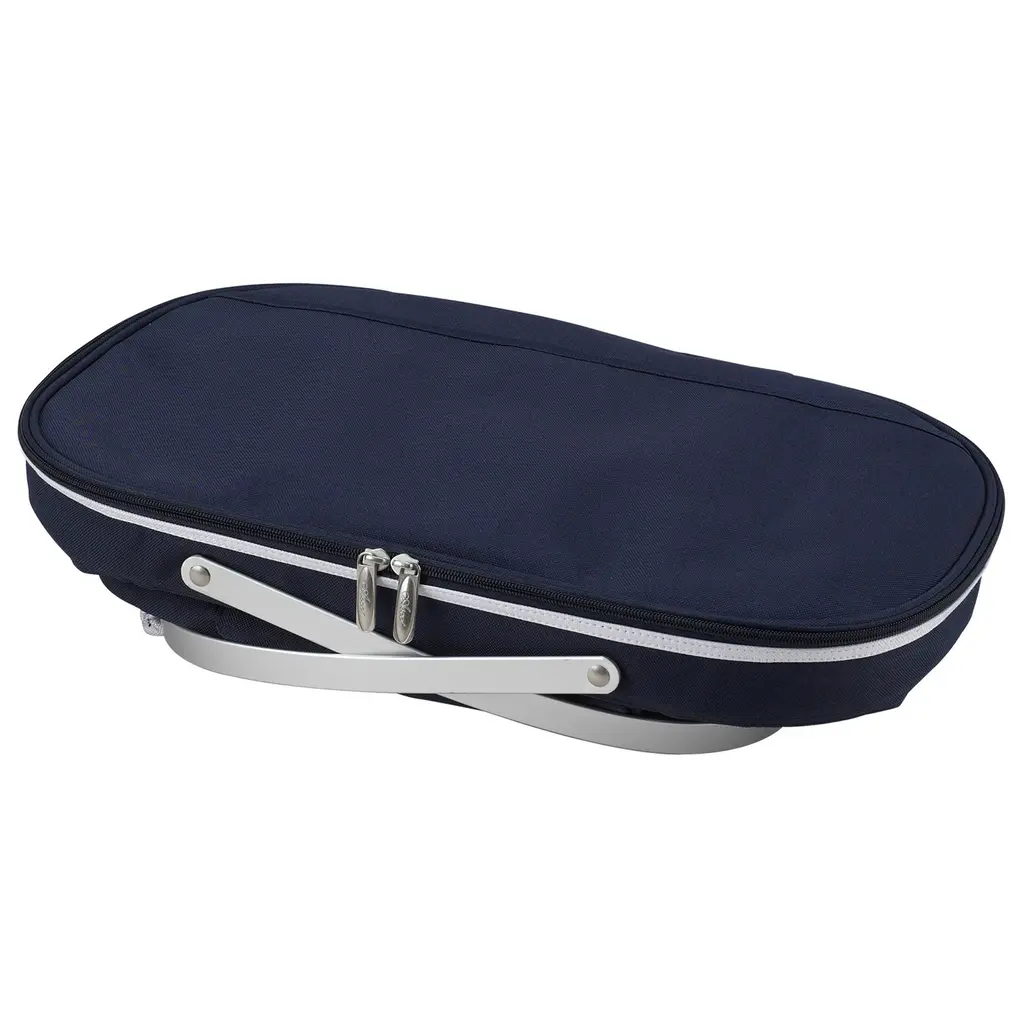 Thermal shield insulated picnic basket for 4 keeps food and drinks at the perfect temperature for hours. Includes 9" plates, glasses, flatware, and napkins. Folds flat for storage and has permanent built in side supports - no installation required, to hold empty cooler upright for easy loading and compact transport after events. Dimensions - 13" H x 9" W x 9" D Securely carry 4 bottles of wine to your next party - restaurant - concert or picnic with this stylish insulated wine carrier Constructed with rugged polyester canvas with a sewn in aluminum frame with padded handles - folds to save space for storage Heat sealed leak-proof insulated liner with removable padded divider to keep wine bottles from clanking Can be used as collapsible multi purpose cooler to keep food and drinks cool for hours - holds up to 18 cans- includes a clip on combination corkscrew Designed by Picnic At Ascot and assembled in the USA - Lifetime Warranty 600D Polycanvas Dishwasher Safe - Plates, Flatware, Glasses (Glasses Top Rack), Spot Clean Bag and Cooler, Machine Wash and Dry Napkins Imported