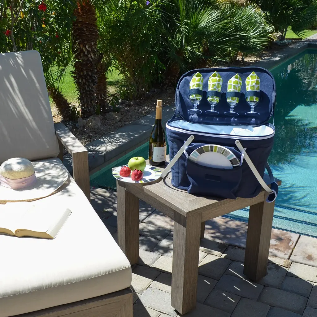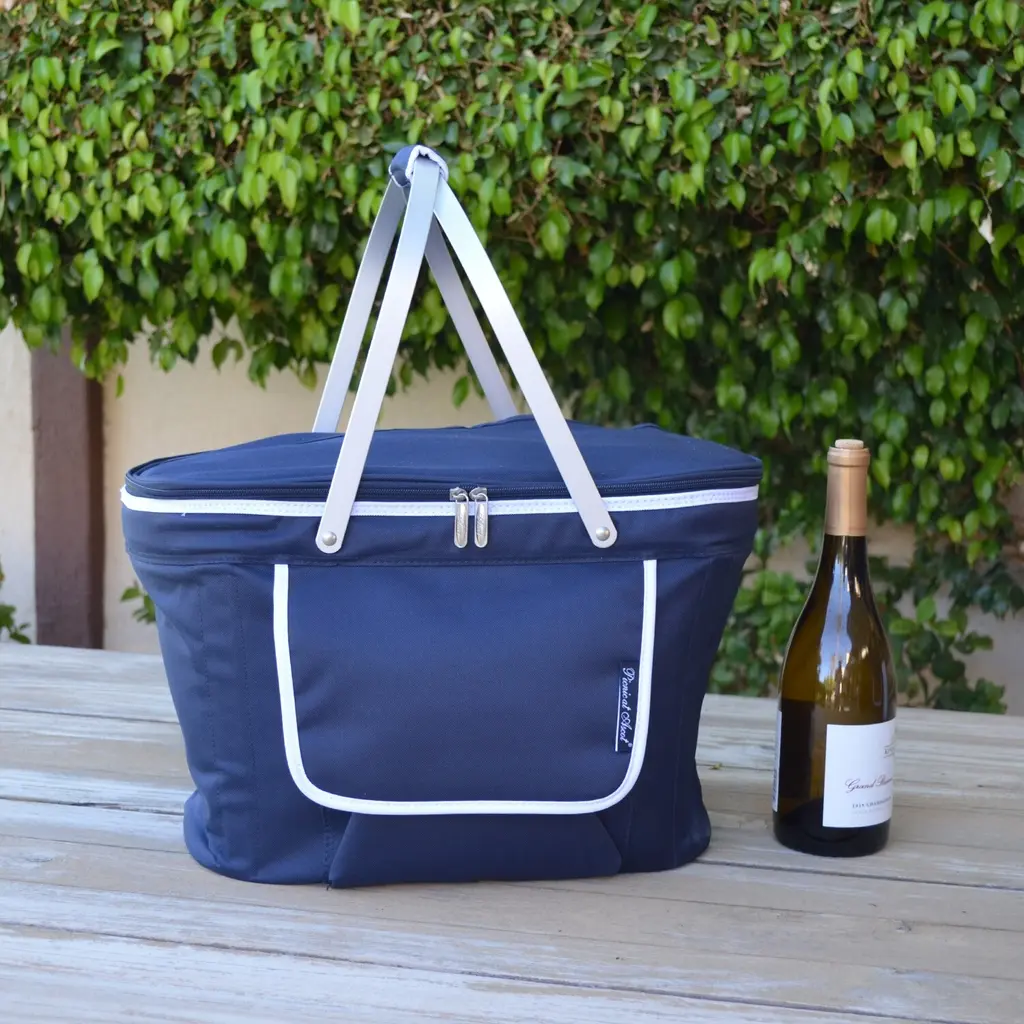 Thermal shield insulated picnic basket for 4 keeps food and drinks at the perfect temperature for hours. Includes 9" plates, glasses, flatware, and napkins. Folds flat for storage and has permanent built in side supports - no installation required, to hold empty cooler upright for easy loading and compact transport after events. Dimensions - 13" H x 9" W x 9" D Securely carry 4 bottles of wine to your next party - restaurant - concert or picnic with this stylish insulated wine carrier Constructed with rugged polyester canvas with a sewn in aluminum frame with padded handles - folds to save space for storage Heat sealed leak-proof insulated liner with removable padded divider to keep wine bottles from clanking Can be used as collapsible multi purpose cooler to keep food and drinks cool for hours - holds up to 18 cans- includes a clip on combination corkscrew Designed by Picnic At Ascot and assembled in the USA - Lifetime Warranty 600D Polycanvas Dishwasher Safe - Plates, Flatware, Glasses (Glasses Top Rack), Spot Clean Bag and Cooler, Machine Wash and Dry Napkins Imported
