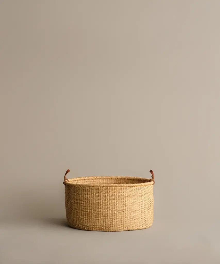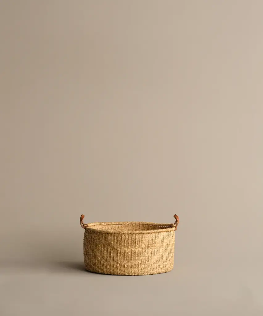 Nesting Basket Natural Handwoven elephant grass basket made in Ghana by artisan weavers. Natural vegetable-tanned leather handles hand stitched in Los Angeles. Due to the handmade nature of this product, each basket may have slight variations.