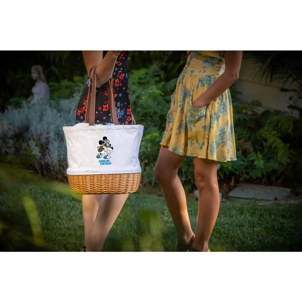 Disney Carolina Panthers Mickey Mouse Coronado Canvas and Willow Basket Tote - Picnic Tote Bag - Beach Tote, (Beige Canvas)Whether it's heading to the tailgate or shopping at your local farmer's market, you can’t go wrong with the Mickey Carolina Panthers Coronado Canvas and Willow Basket Tote. With a willow and canvas construction, a fully-lined interior, and Mickey Mouse himself playing quarterback for your favorite NFL team, you won't just have a bag to hold your stuff, but a durable statement piece. Designed with a modern, active lifestyle in mind, this roomy tote is a must-have for the best fans we know: Disney and NFL!1 Handwoven Picnic Basket (14.17" x 11.42" x 13.4")80% Canvas; 10% Willow; 5% Poly/Cotton; 3% PU Leatherette; 2% Cotton