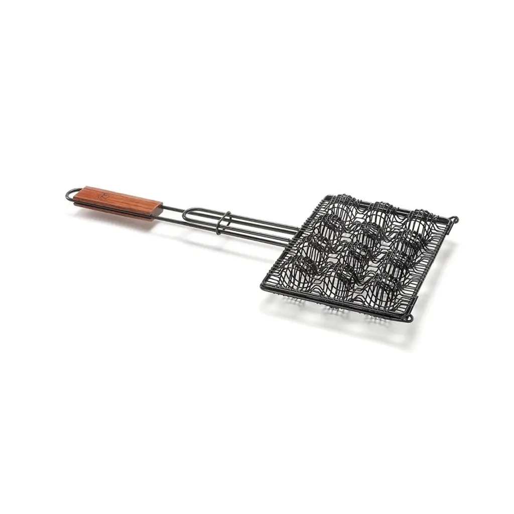 Imagine cooking meatballs on the grill, keeping them in one-piece and cooking them evenly. With this Meatball Basket you can grill your meatballs while keeping them safely in place with the basket's locking mechanism. This will help you easily flip the meatballs over the open flames. With a weaved construction designed to drain excess fat, the basket grills up to 12 tasty meatballs without sacrificing any flavor. Features high quality nonstick coating that contains no PTFE's or PFOA's and long rosewood handles for easy and safe turning. A sure-fire way to add zest to your cookout.