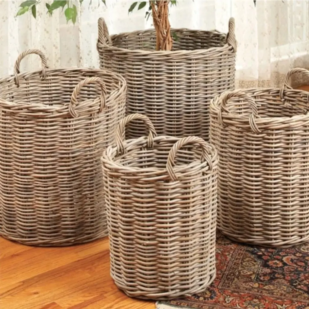Norman Coastal Beach Grey Woven Rattan Round Basket - Set Of 4