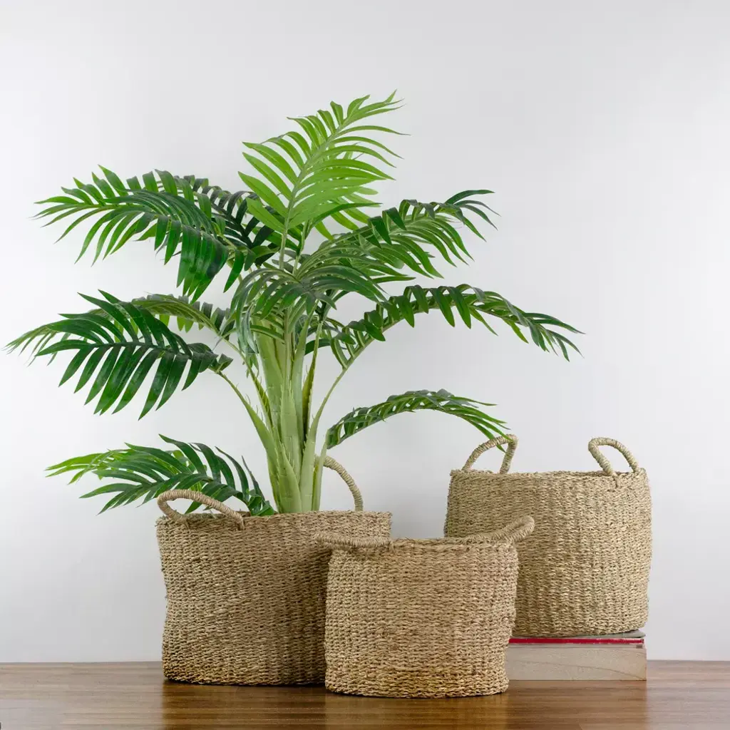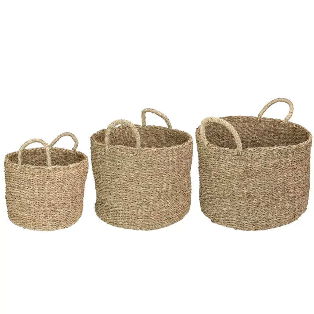 Add old-fashioned country charm to your home with this lovely basket set. These simple, seagrass style baskets are a wonderful rustic addition to the living room, kitchen and bedroom. They are great functional pieces to store blankets, or to display as a simple accent by themselves. Features: Sturdy round seagrass baskets Solid beige woven design Features large handles for easy carrying Can hold various household or office items Easily nests inside the largest for easy storage Recommended for indoor use only Dimensions: Small: 8.75" high x 11" diameter (12.5" high with handle) Medium: 9.45" high x 12.5" diameter (13.5" high with handle) Large: 10.25" high x 14" diameter (14" high with handle) Material(s): seagrass
