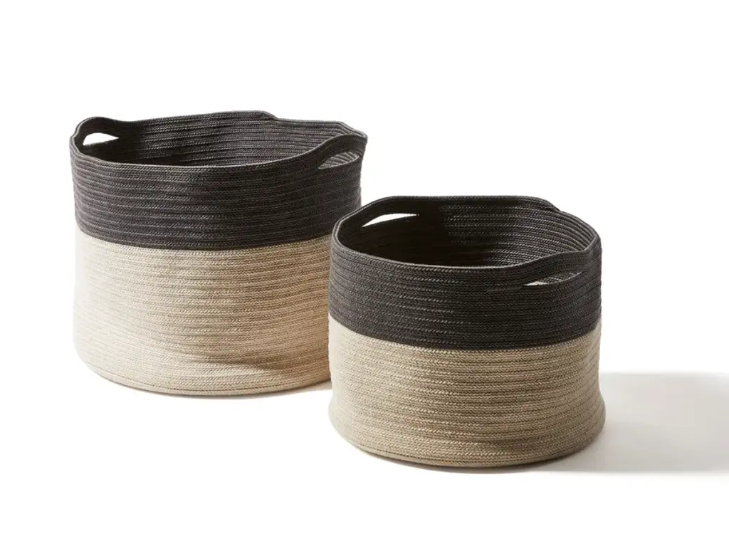 Add old-fashioned country charm to your home with this lovely basket set. These simple, seagrass style baskets are a wonderful rustic addition to the living room, kitchen and bedroom. They are great functional pieces to store blankets, or to display as a simple accent by themselves. Features: Woven designed round wicker basket Beige with a black color block Features large handles for easy carrying Can hold various household or office items Easily nests inside the largest for easy storage Recommended for indoor use only Dimensions: Small: 10.25" high x 11" diameter (12.5" high with handle) Medium: 11.75" high x 12.5" diameter (15" high with handle) Large: 12.5" high x 14" diameter (16.5" high with handle) Material(s): seagrass